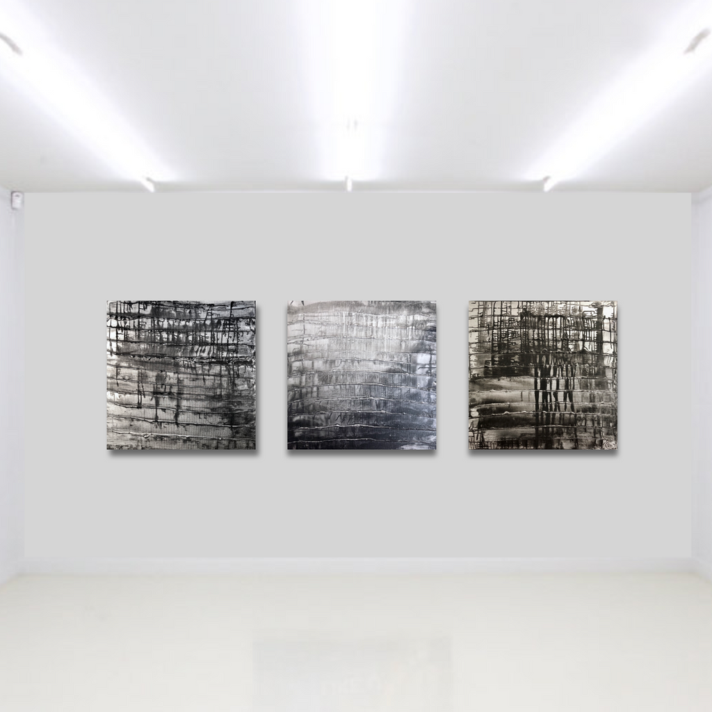 Mixed technique: Silver&glitter pigments, glue, black ink on canvas