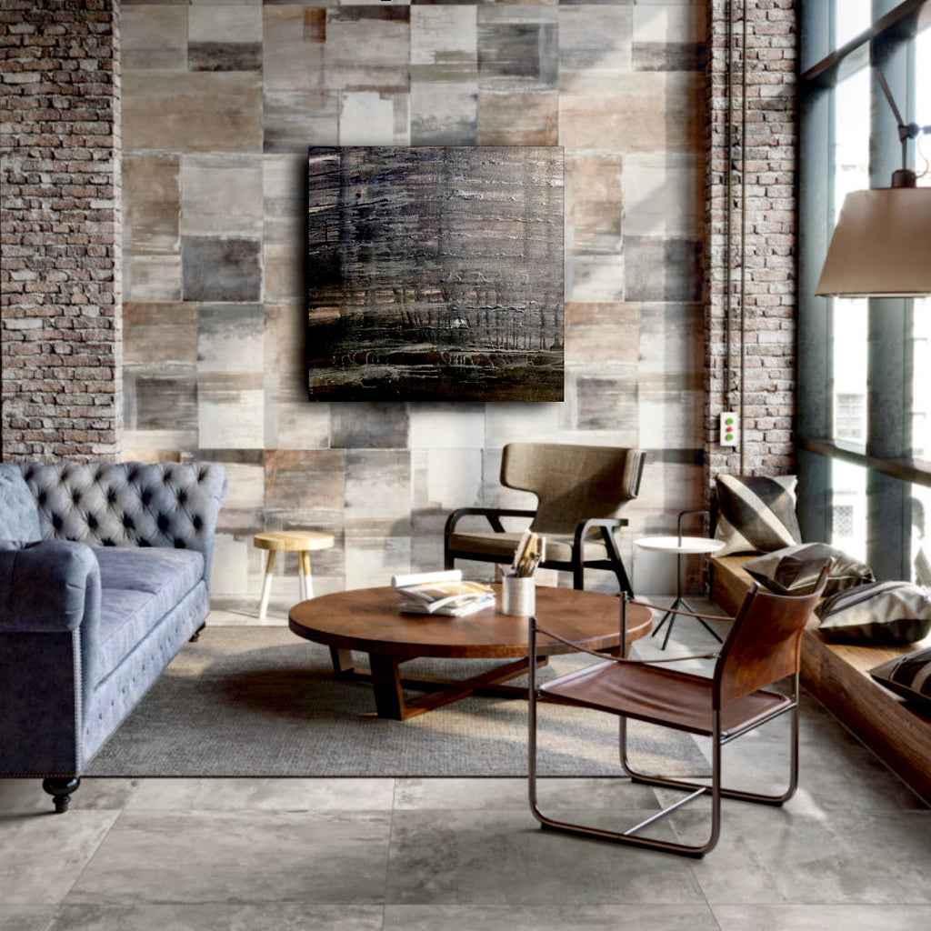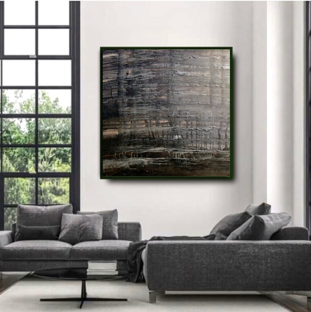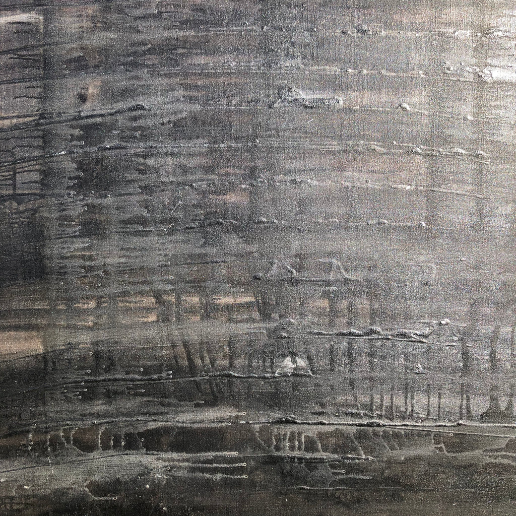 Mixed technique: Black ink, silver pigment on canvas