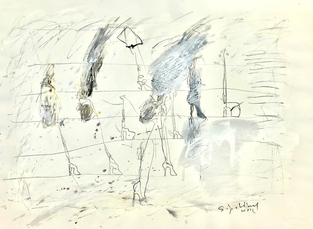 Mixed technique: Pigments, glue, black ink, charcoal and lead pencil on paper