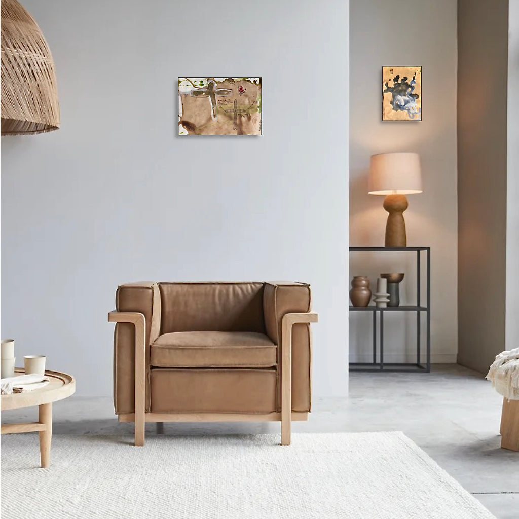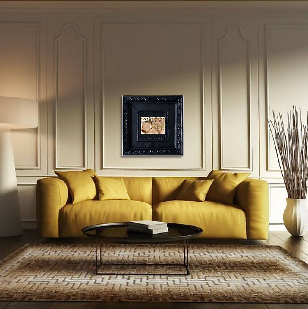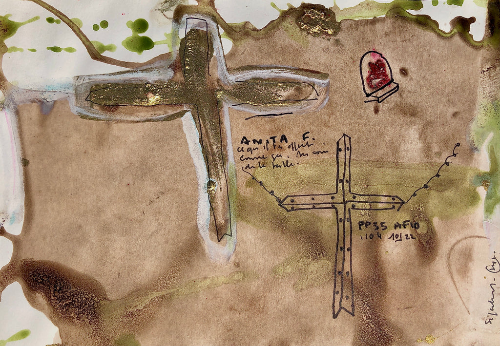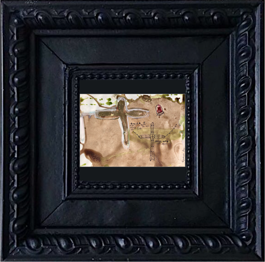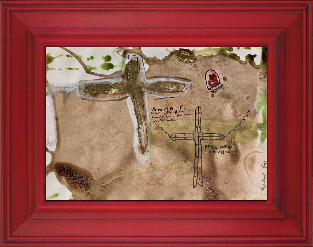 A poetic atmosphere. This Xsmall painting is a mix of James techniques. Here he uses golden pigments and his own watercolor’s style with beiges and greens. With the golden cross, James wants to express the Sacred, the spirit of religious icons as his model for this Presence painting performance is a Polish woman living in Paris.