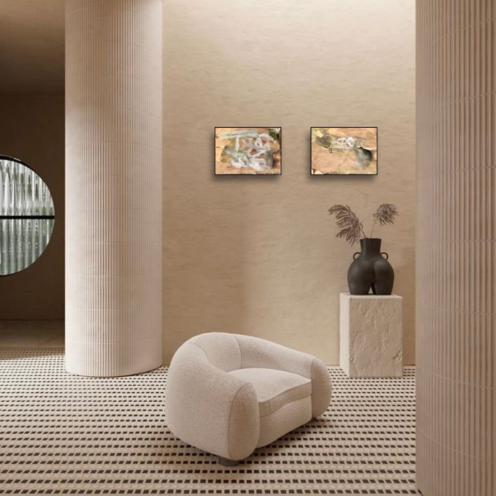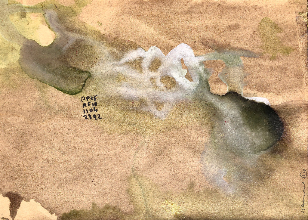 This XS painting is made on beige recycled paper, in James’s own watercolor technique. The beige of the paper is used as a background color. A very soft palette of light golds, cool whites and beige, he creates a peaceful atmosphere after the storm...