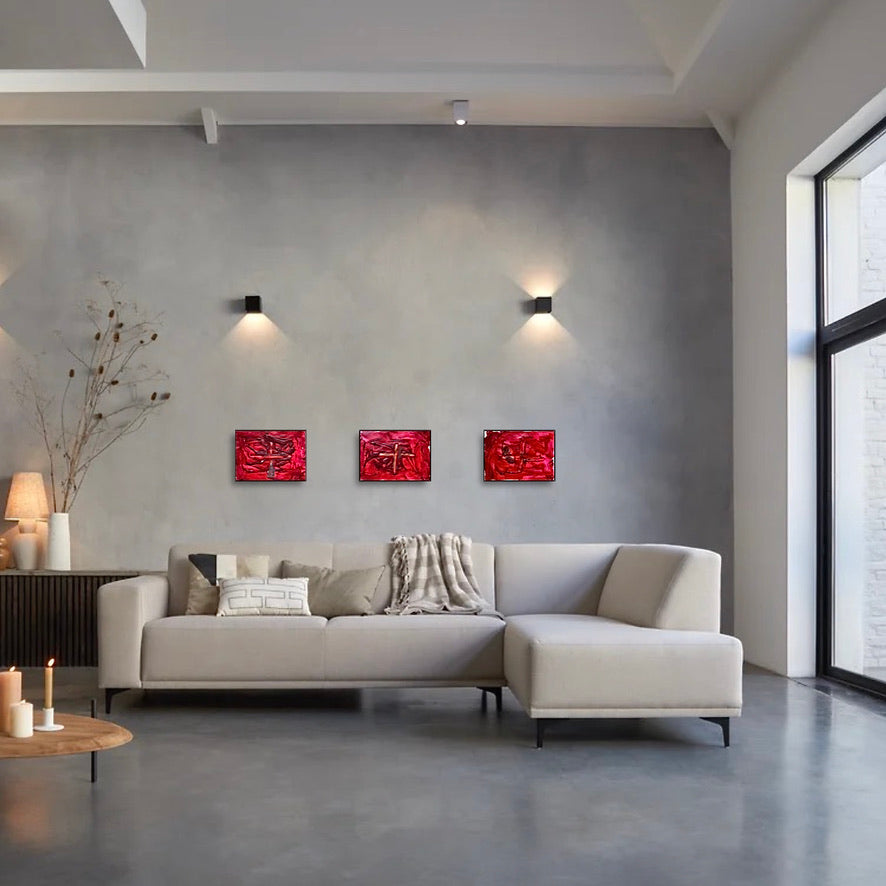 « Each painting is like a zoom of an emotion ». A small painting with a cross on a strong red background. With the cross, James wants to express the powerful Polish Catholicism as his model for Presence painting performance was a Polish woman living in Paris.