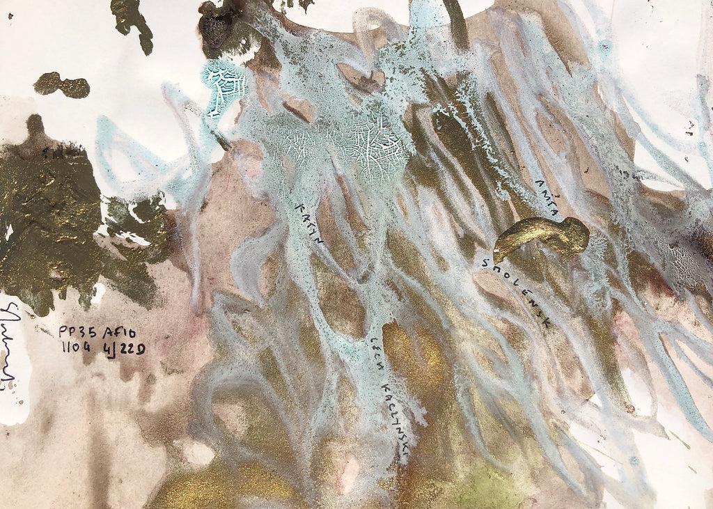 ...this painting was made the day after the airplane crash, in memory of the Polish President Lesh Kaczyński in Slomensk (10/04/2010). That’s why you encounter written words linked to this disaster and the liquid paint evokes the bad weather.
