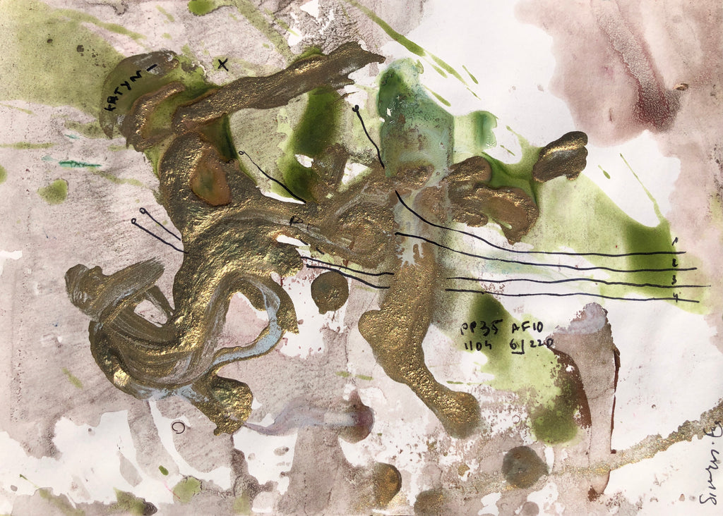 This XS painting on paper reflects the liquid technique of James with salient painted element in golden pigments. A very contrasted palette of greens and cool beiges and whites creates a vibrant atmosphere...