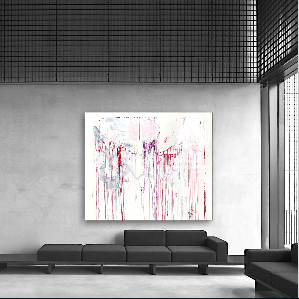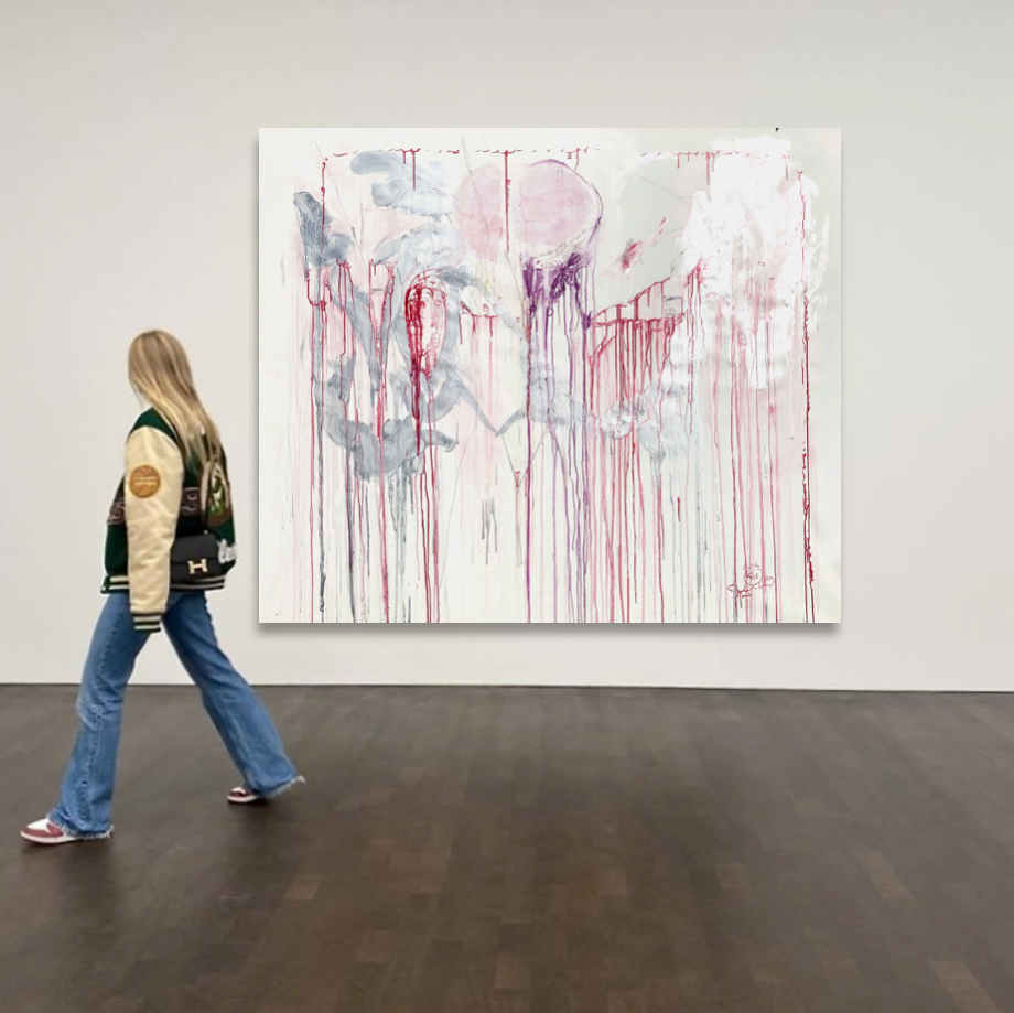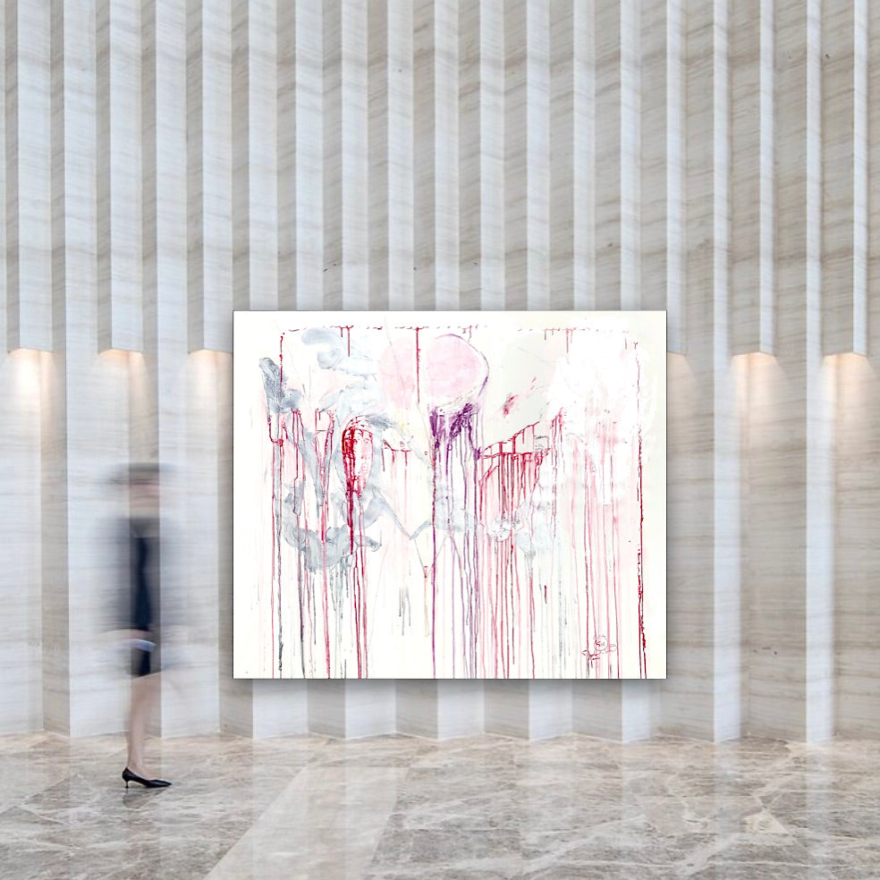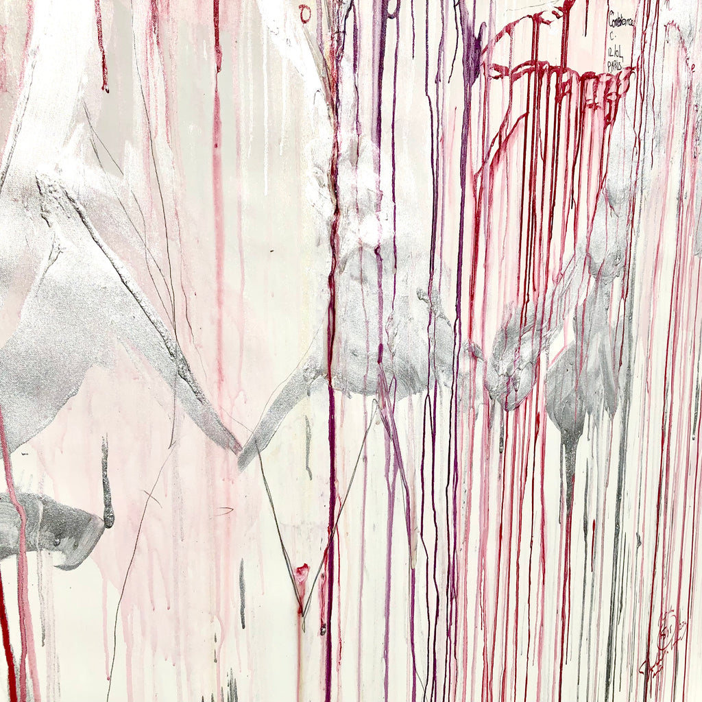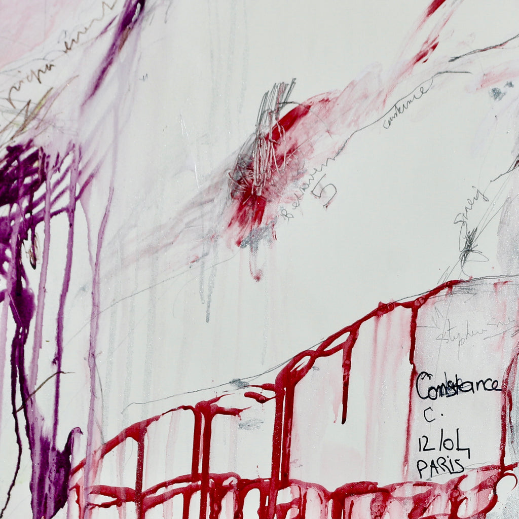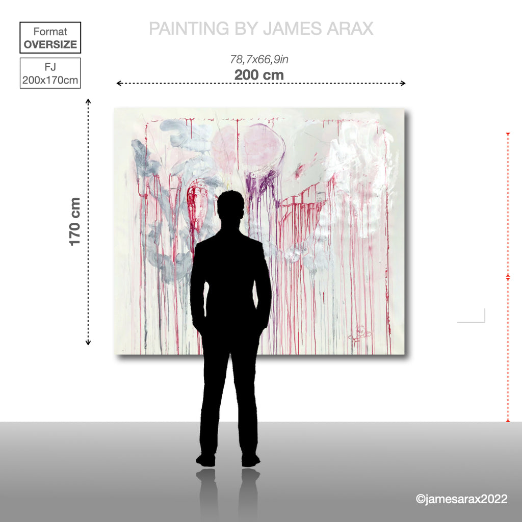 James was inspired by his next-door neighboor, a beautiful young woman. She was amazing, she used to dance in the courtyard of James’s Art Gallery in Paris-Le Marais. Long brown hair, slim and long silhouette, porcelain skin, dancer’s port de tête. James Arax proposes a subtle and timeless abstract painting of her with a beautiful color palette in his OpenFlow style: long drips from purple to red and very light pink.