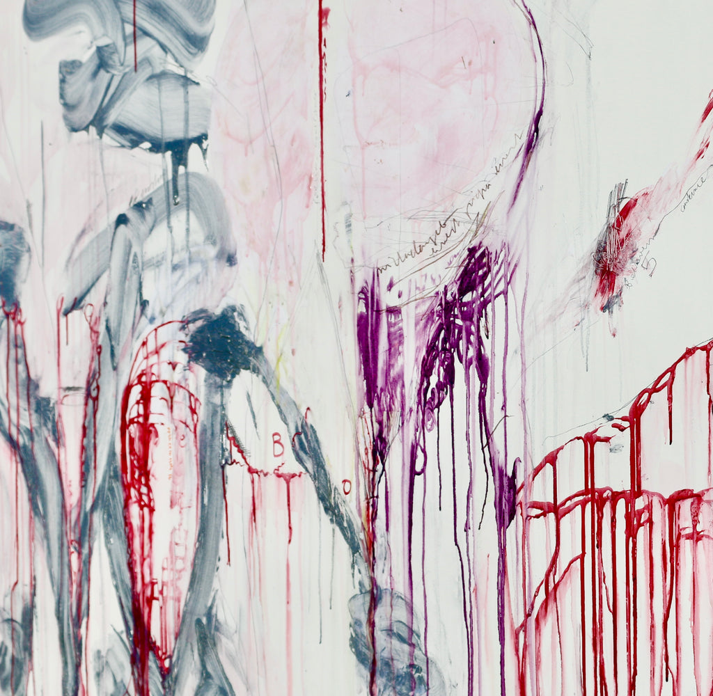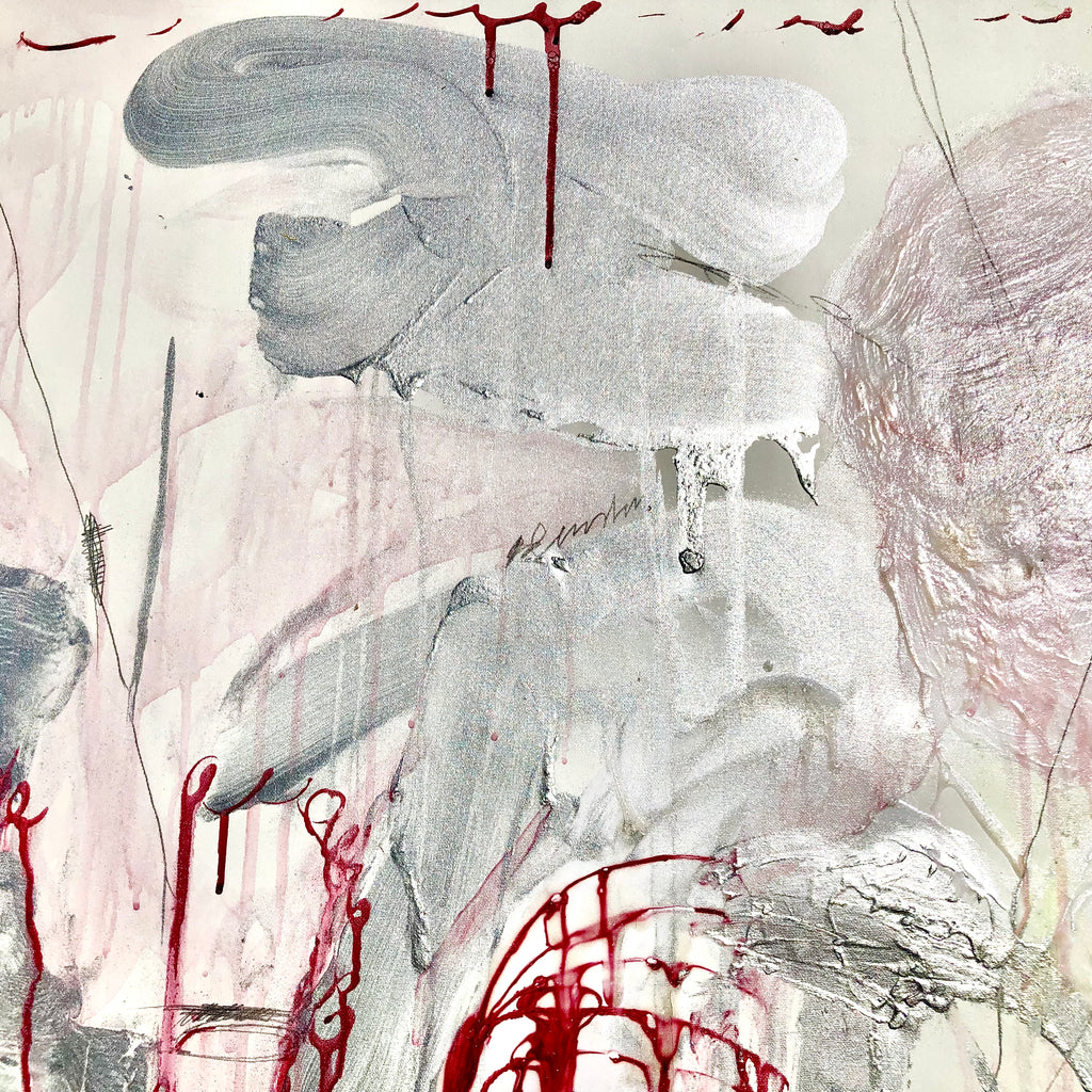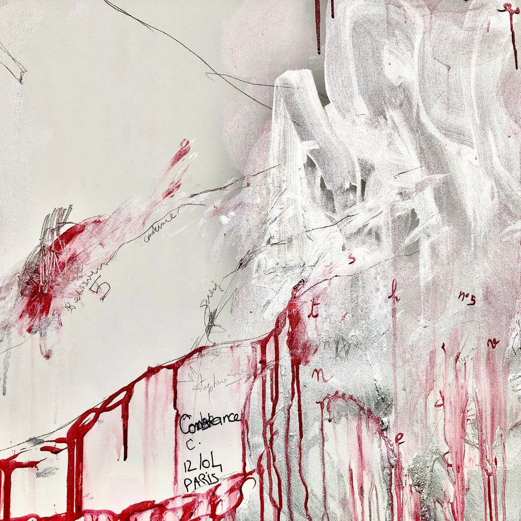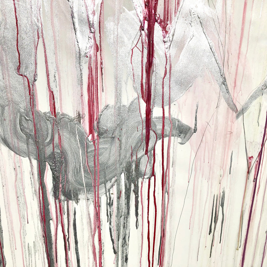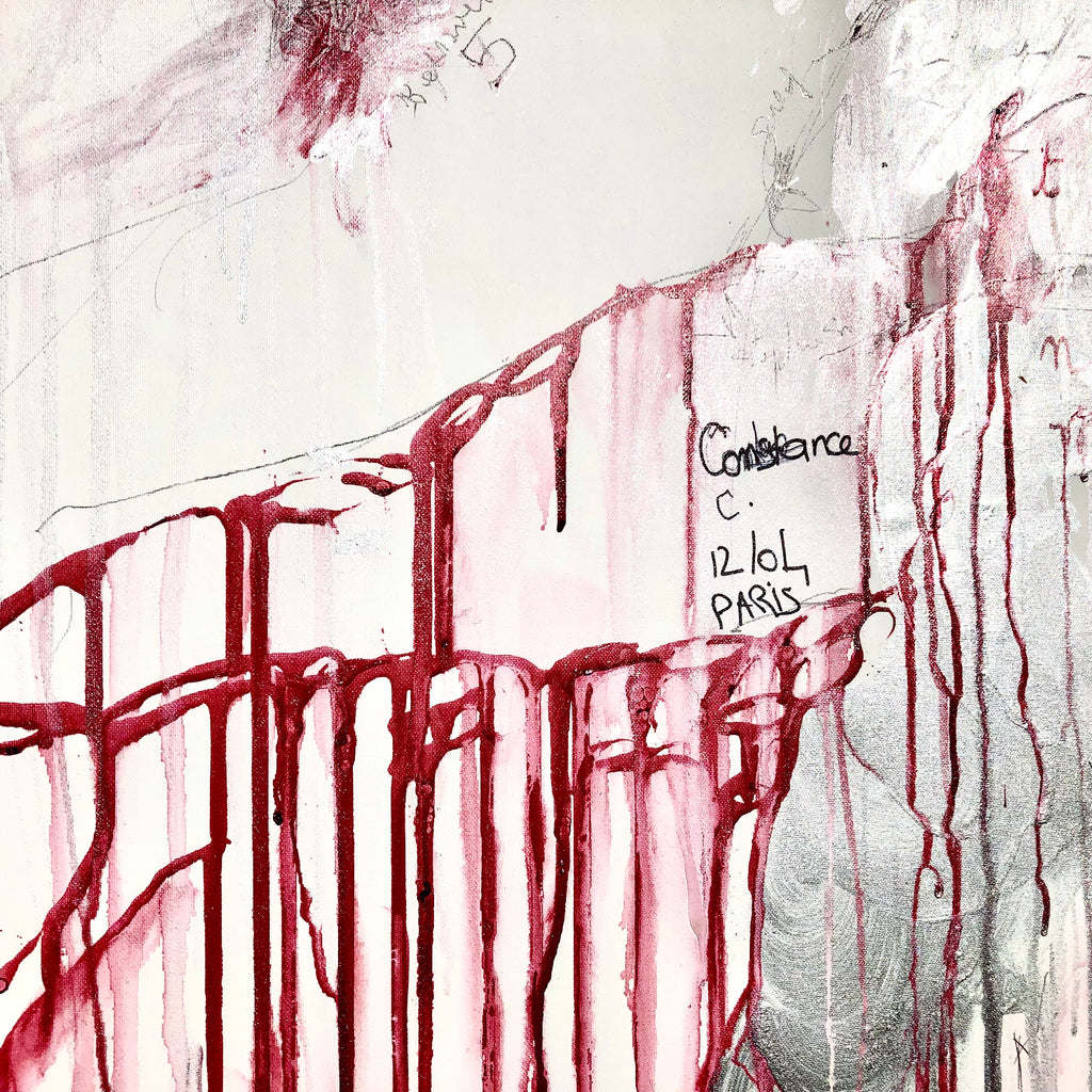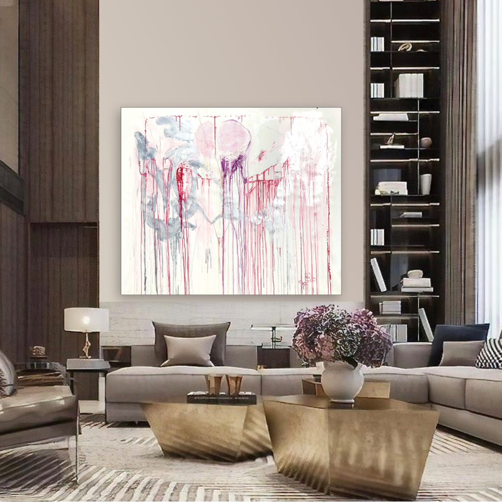 James was inspired by his next-door neighboor, a beautiful young woman. She was amazing, she used to dance in the courtyard of James’s Art Gallery in Paris-Le Marais. Long brown hair, slim and long silhouette, porcelain skin, dancer’s port de tête. James Arax proposes a subtle and timeless abstract painting of her with a beautiful color palette in his OpenFlow style: long drips from purple to red and very light pink.