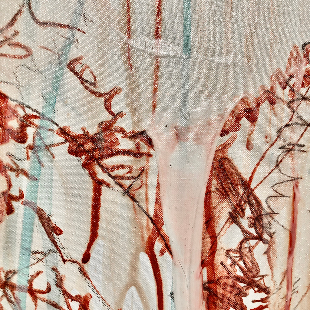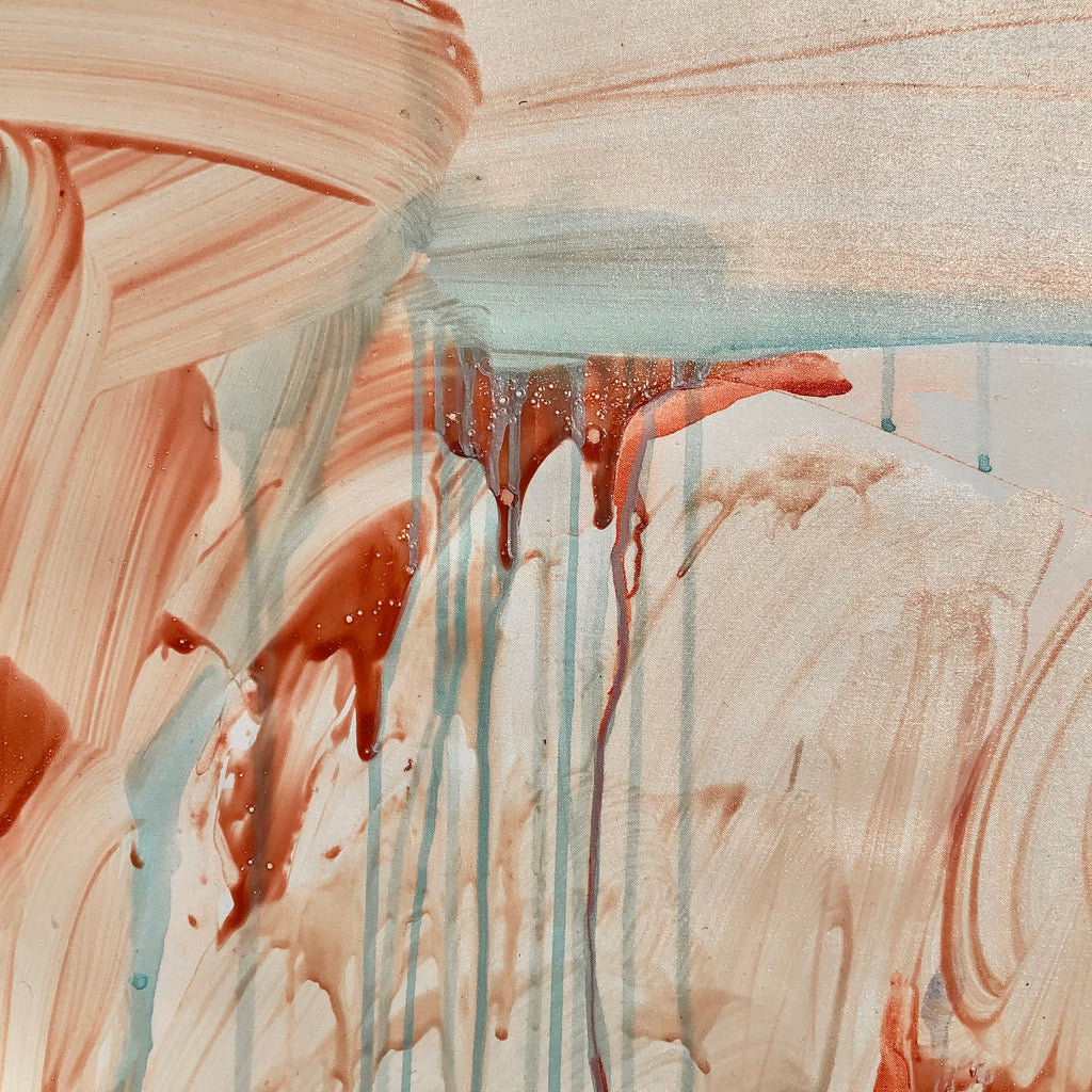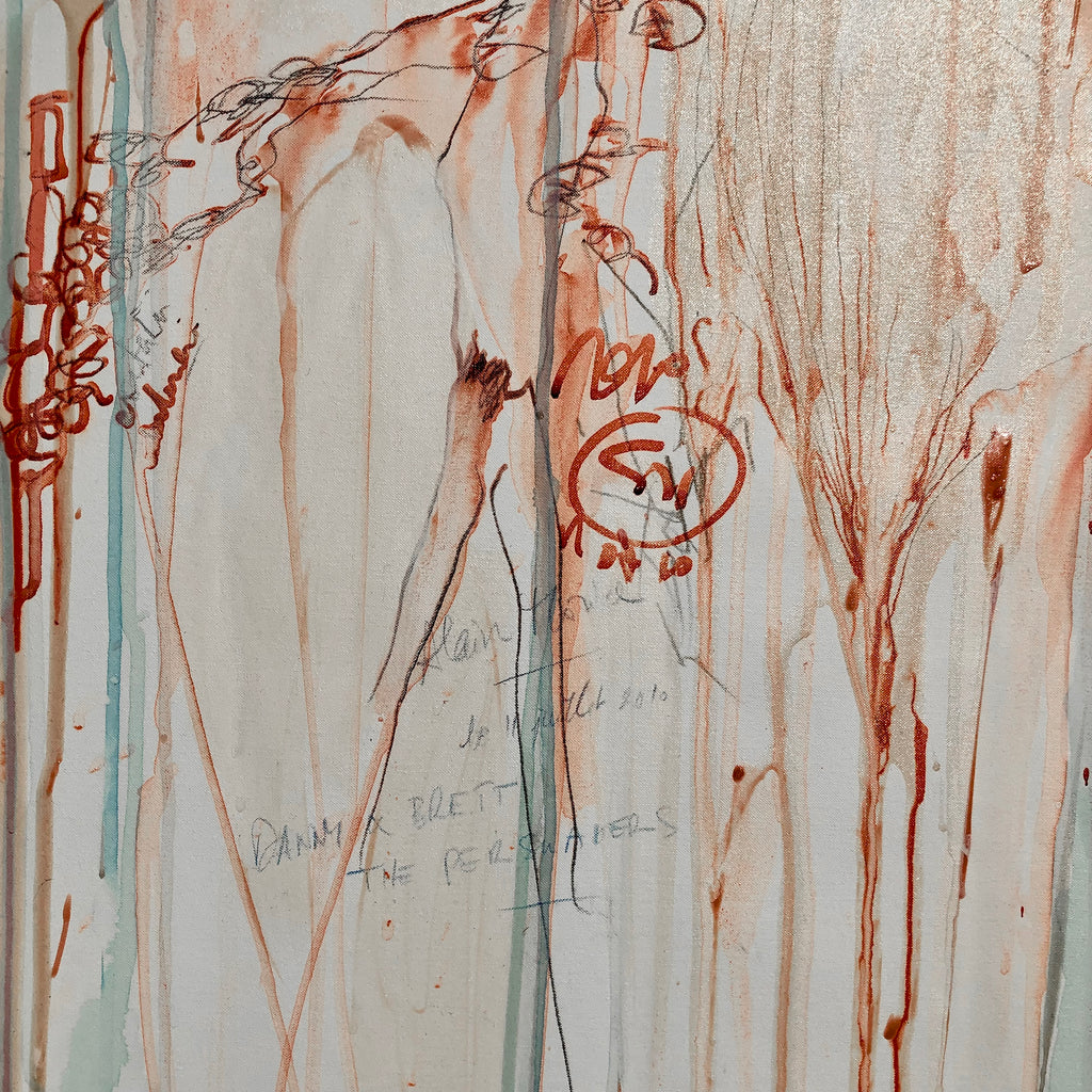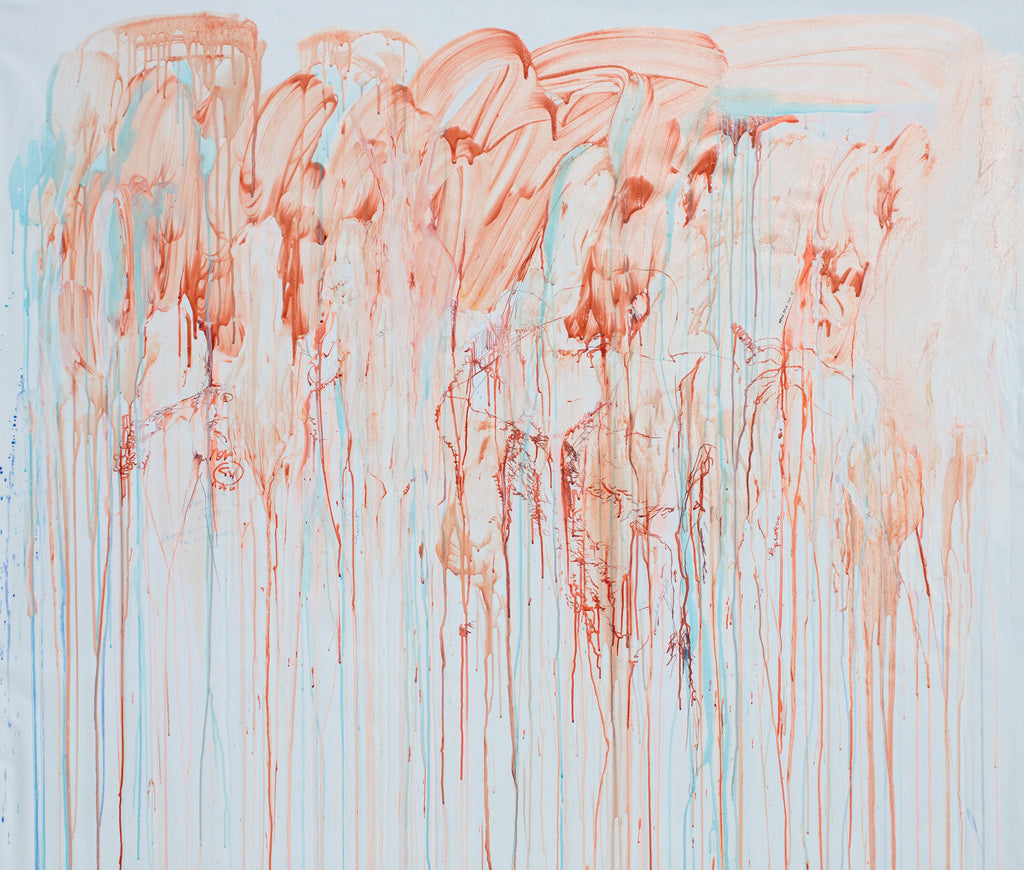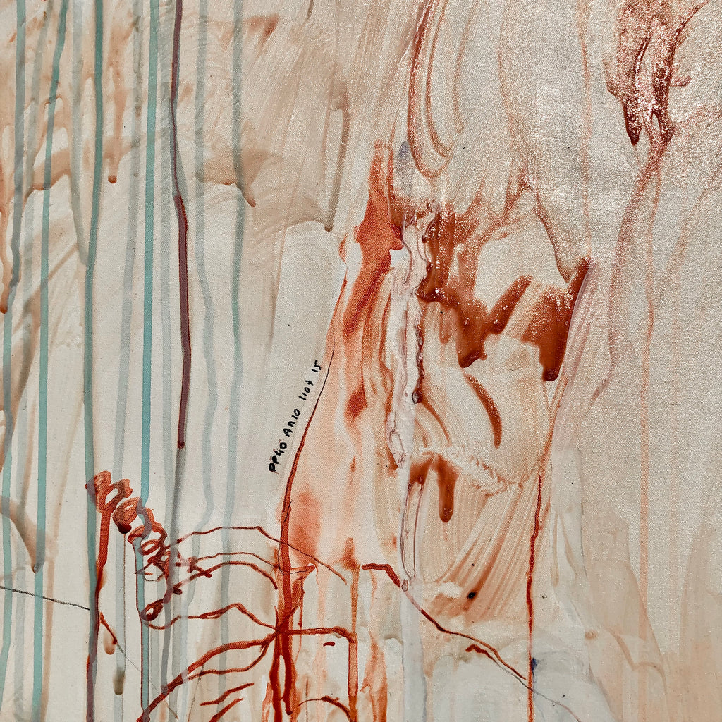Mixed technique: Colored pigments, glue, orange&blue ink on nylon canvas