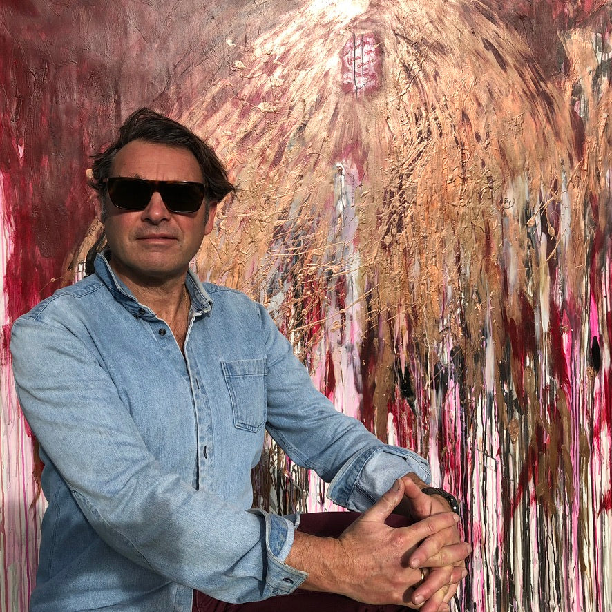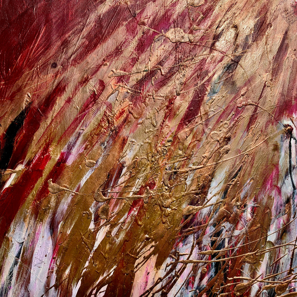 This XL painting is very powerful, energetic, almost like a volcano’s explosion. It evokes the popping of champagne corks. A stunning colorful painting for a large space. The copper pigments seem projected onto the canvas mixed with a red palette in the unmistakable OpenFlow style of James…
