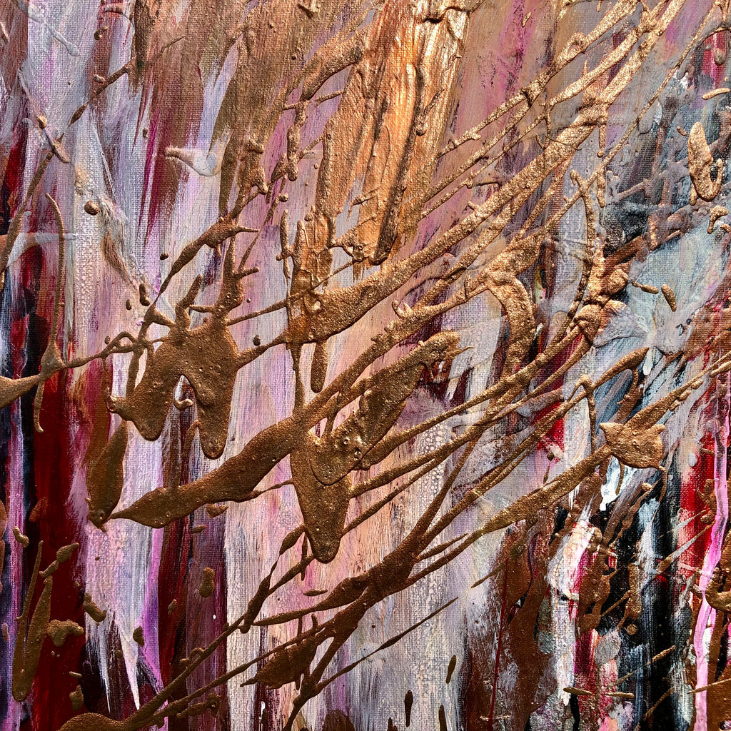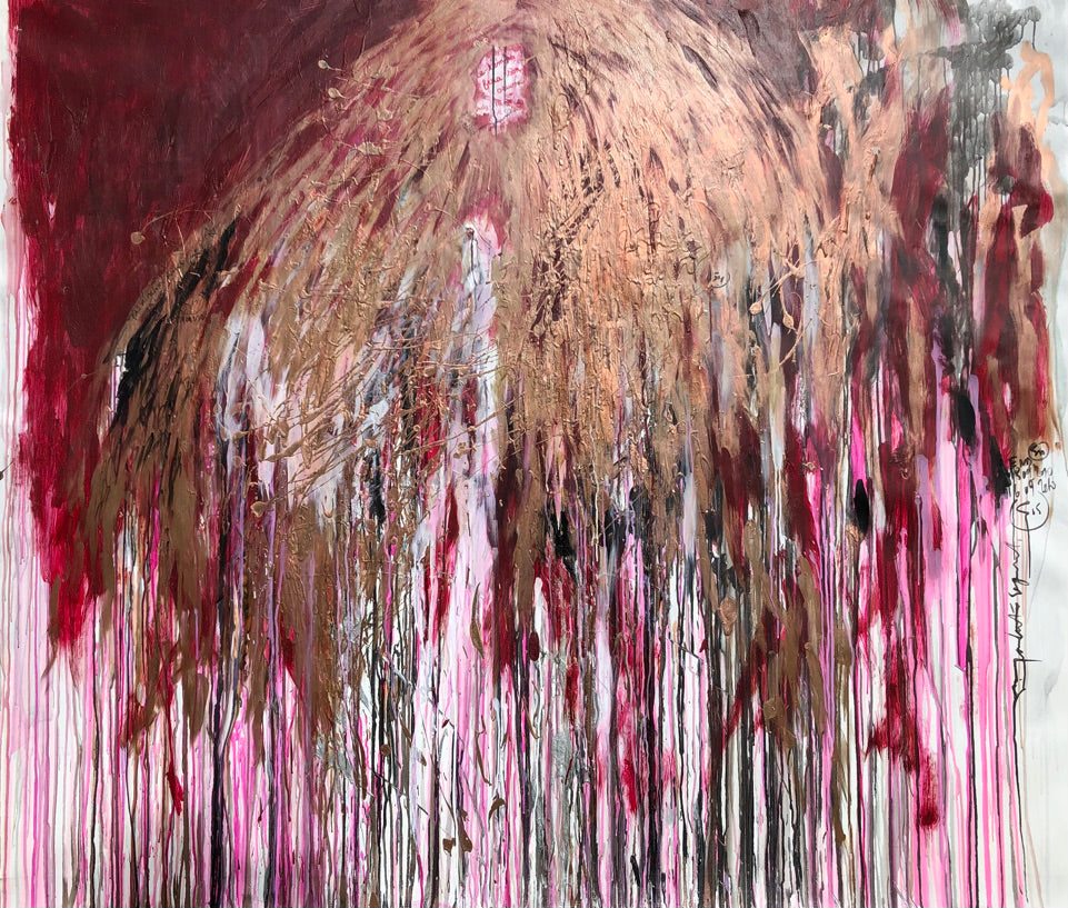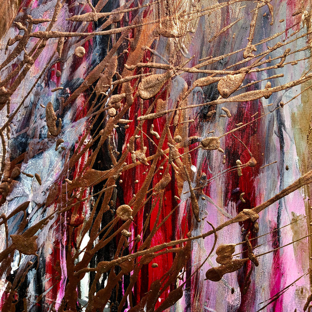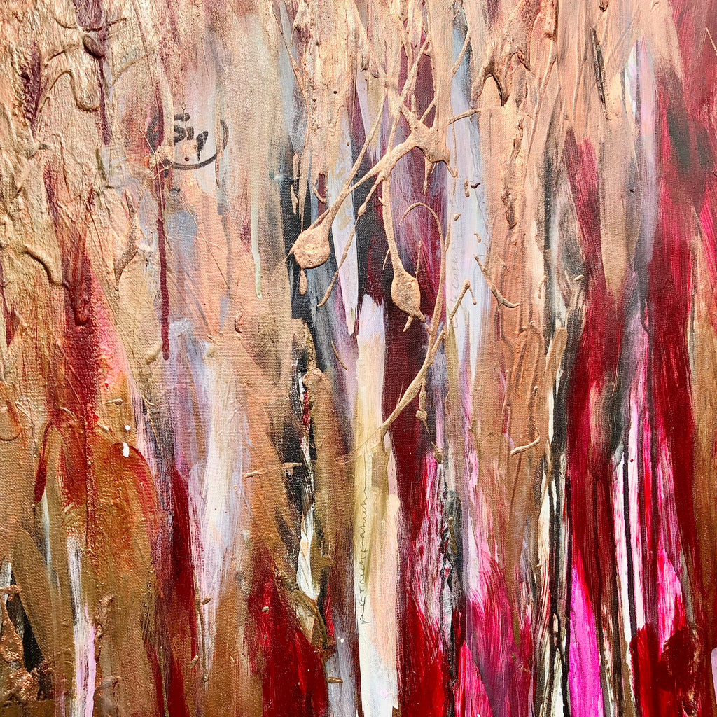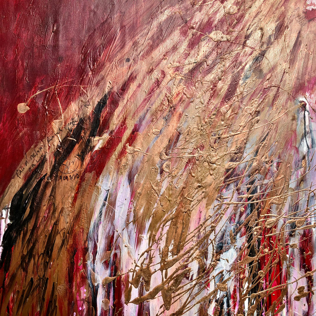 Mixed technique: Acrylic, copper pigments, glue, pink red black ink on canvas