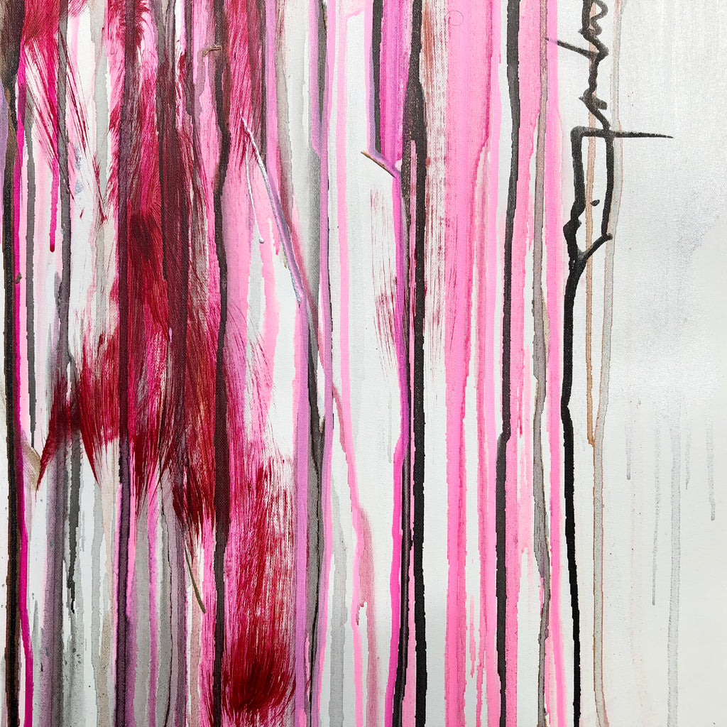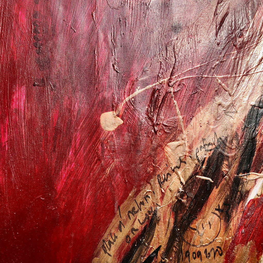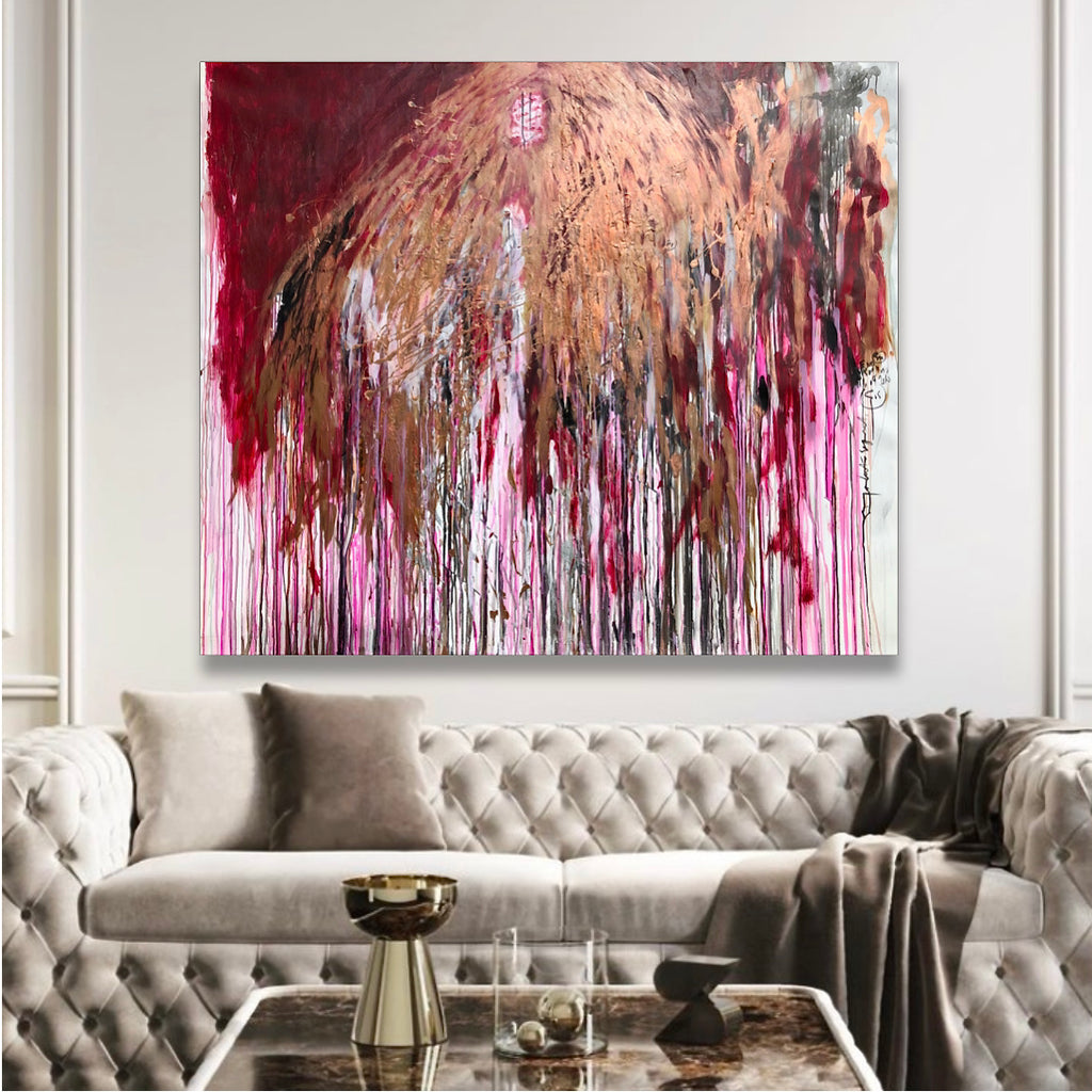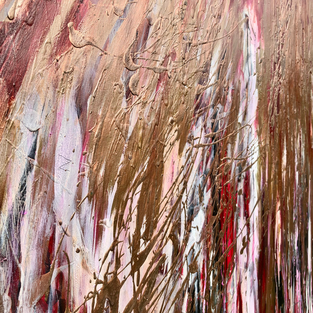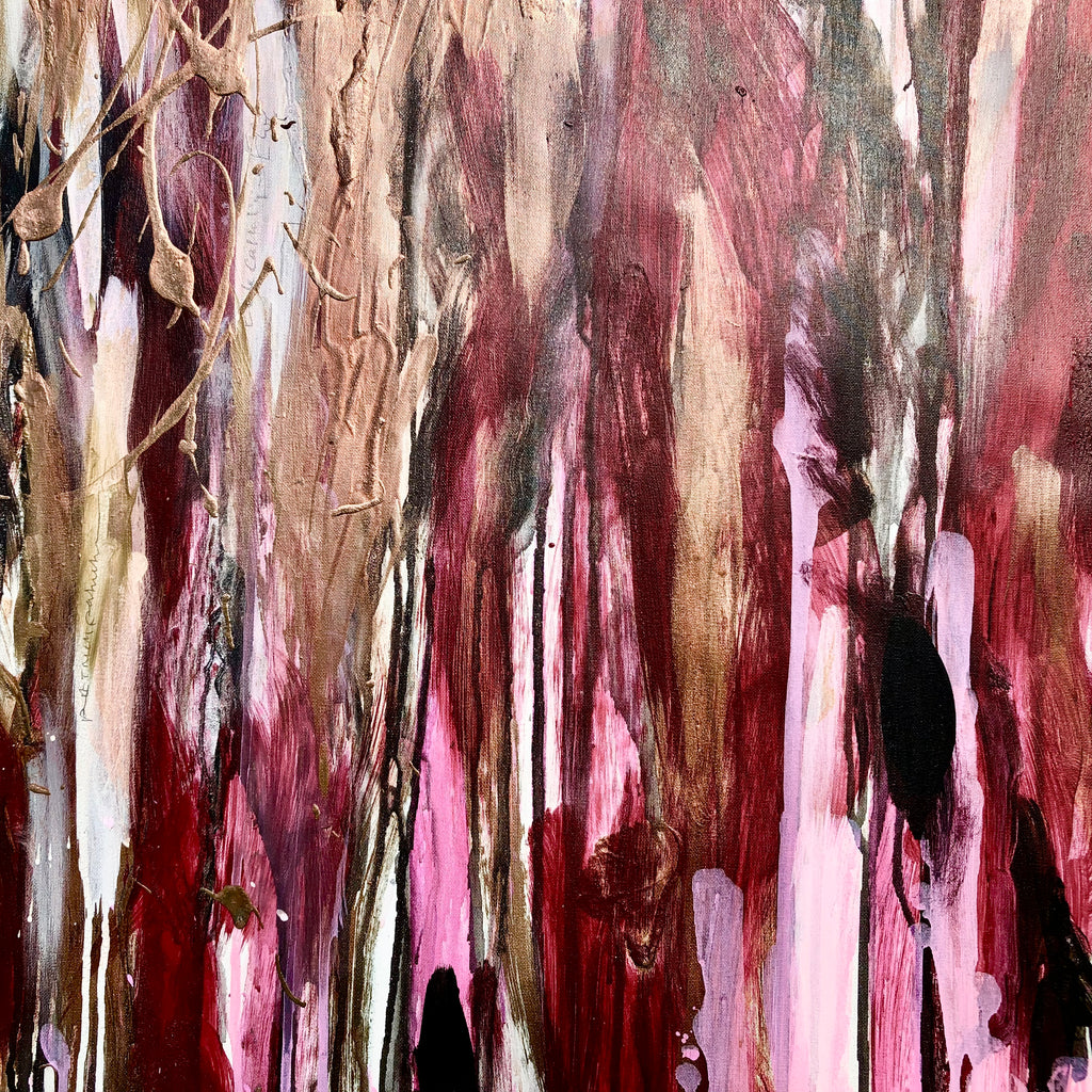 Mixed technique: Acrylic, copper pigments, glue, pink red black ink on canvas