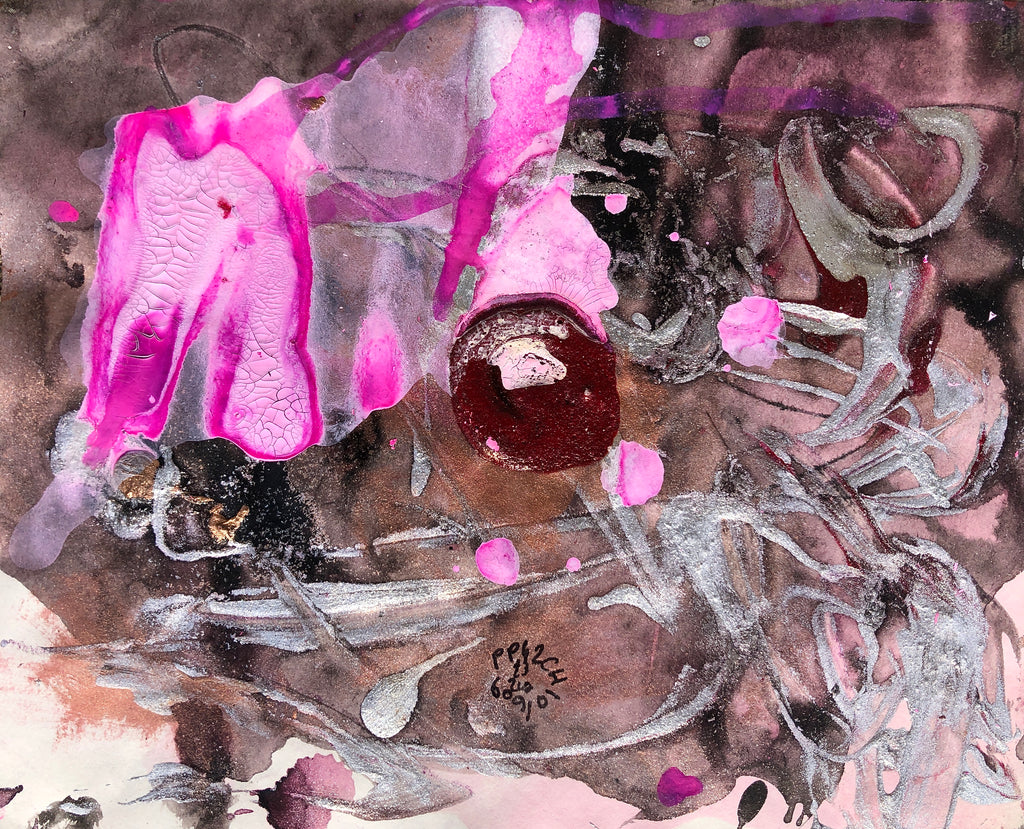 Mixed technique: Acrylic, silver pigments, red black and pink ink, glue on paper