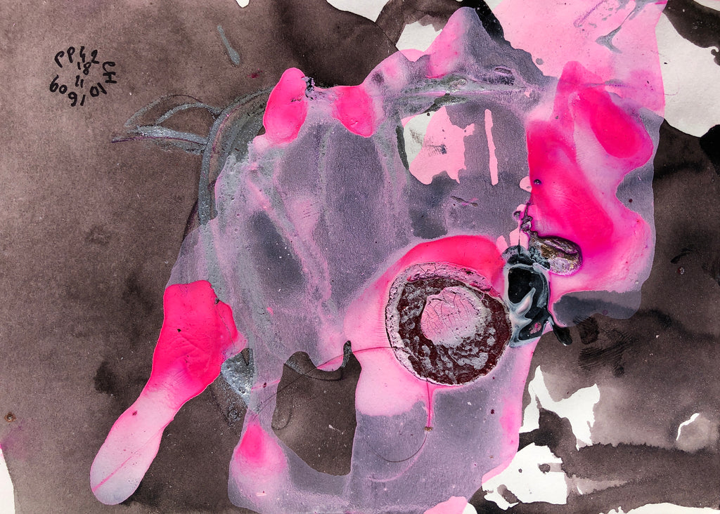 Mixed technique: Acrylic, brown black and pink ink, glue on paper