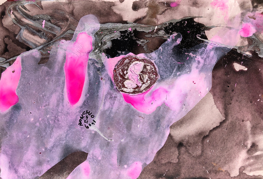 Mixed technique: Acrylic, copper pigments, black pink ink, glue on paper