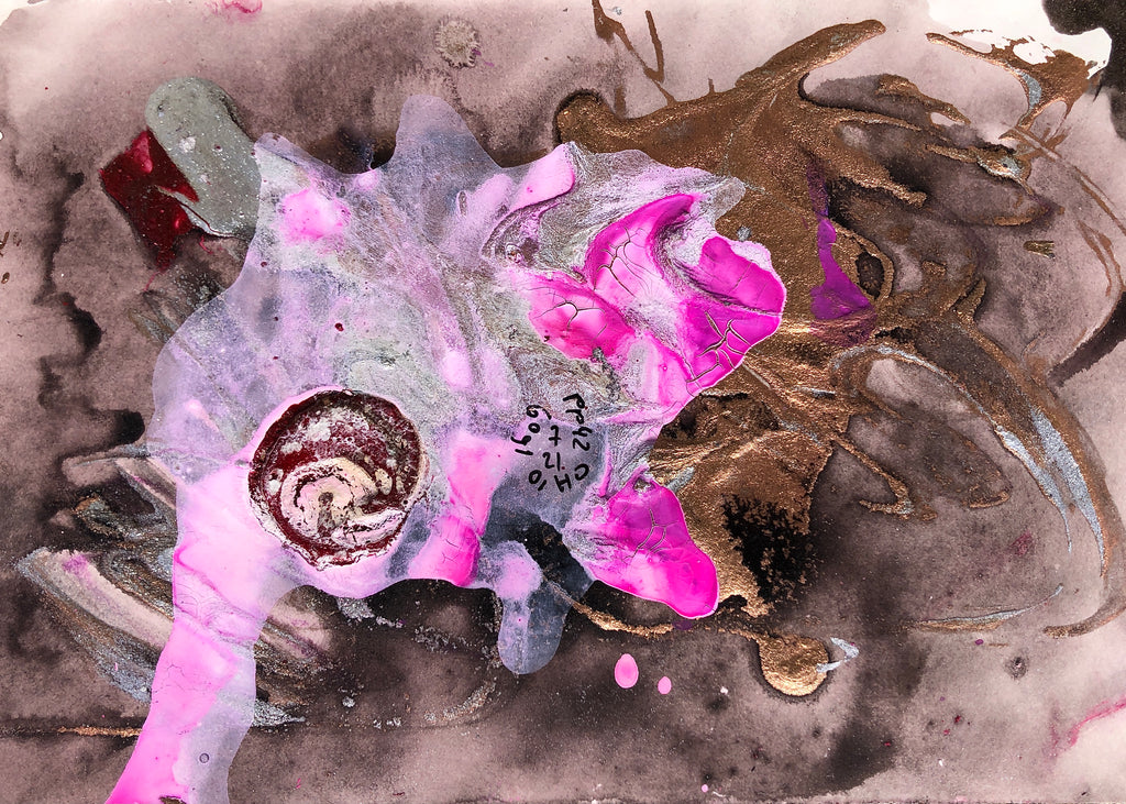 Mixed technique: Acrylic, copper pigments, brown and pink ink, glue on paper
