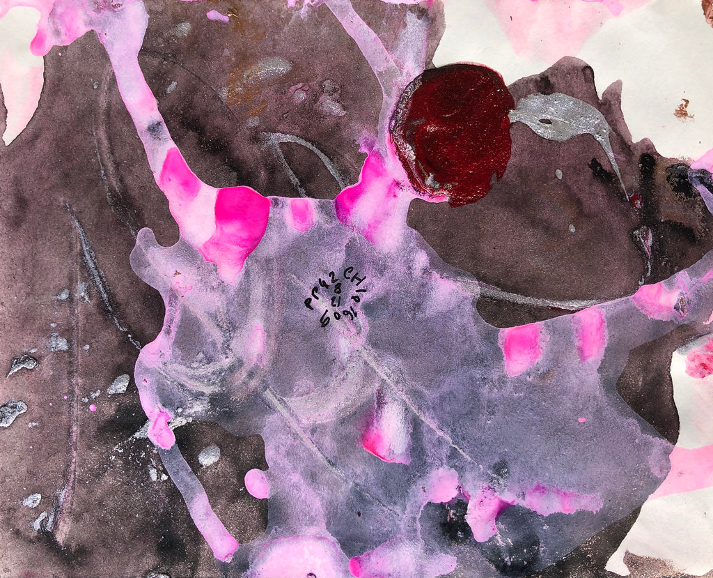 Mixed technique: Acrylic, copper pigments, brown black and pink ink, glue on paper