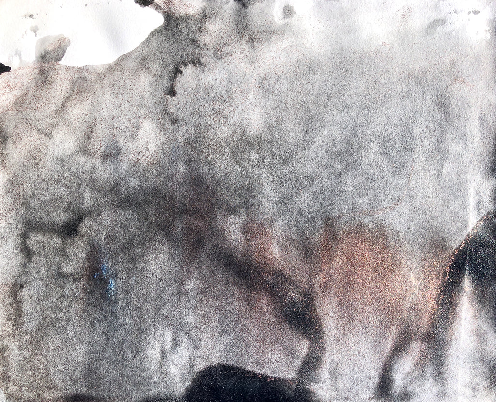 Mixed technique: colored pigments, glue, green,blue, brown ink on paper