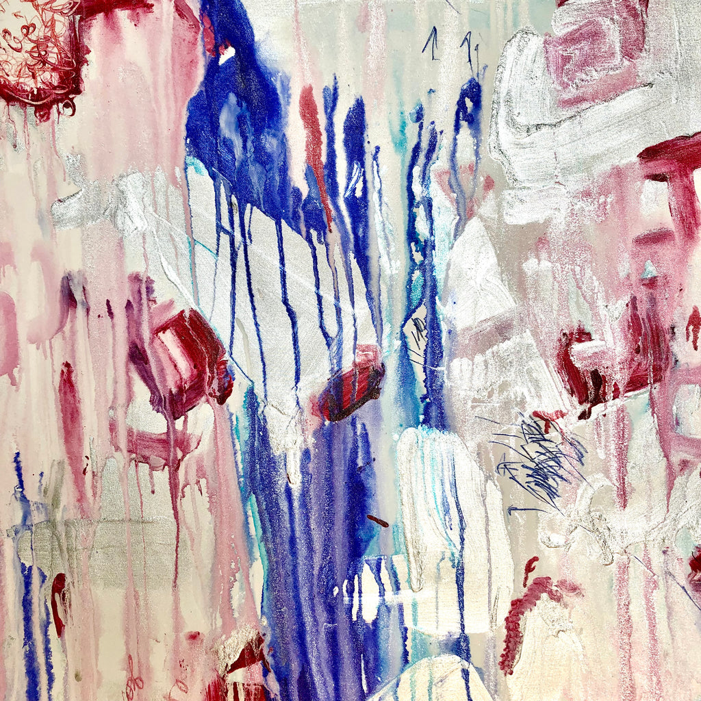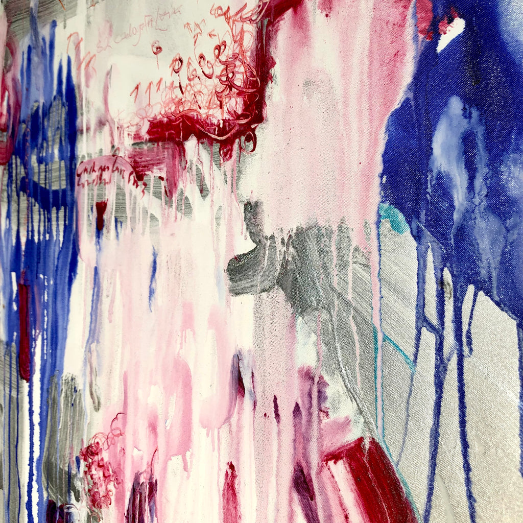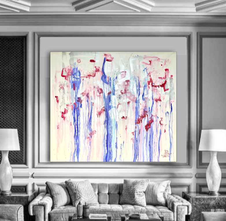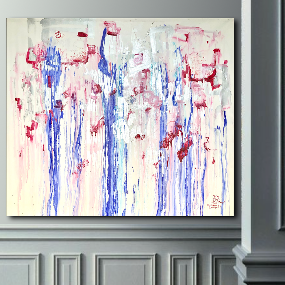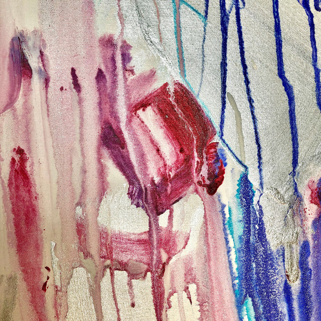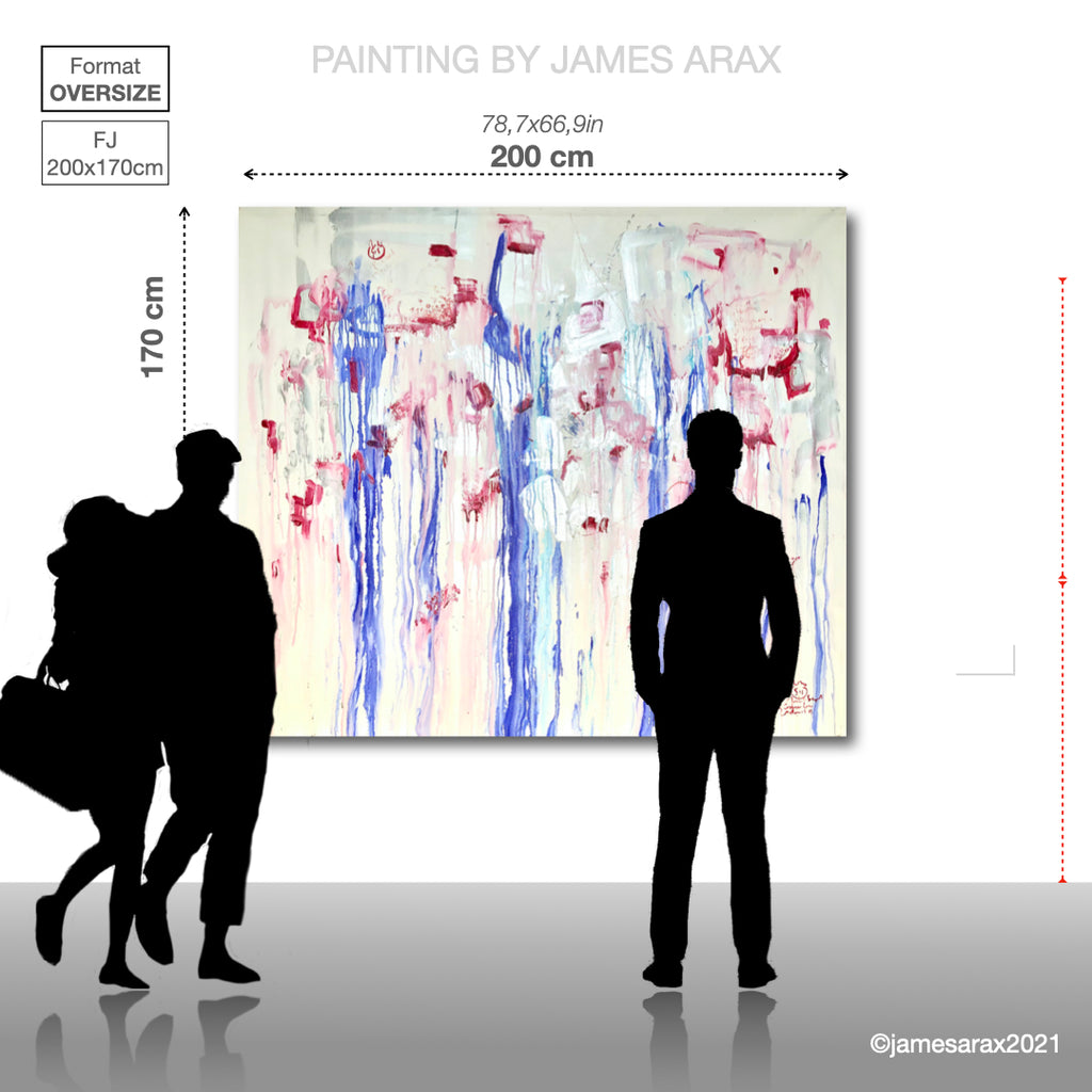 … Even in this pictures you can see how the silver can change in the same canvas from grey to white, just because of the light in the room or gallery. You have more than one impression in front of the canvas, depending on the weather and the moment of the day. A new kind of impressionism proposed by the contemporary painter James Arax. James was inspired by a Londonian fashionista. She has a great look with a beautiful dress and incredible red shoes. This painting was realized in his London studio. This painting is representative of James’s Open Flow technique : drips in purple-blue, light and dark pink. The details evoke her stunning colored dress.