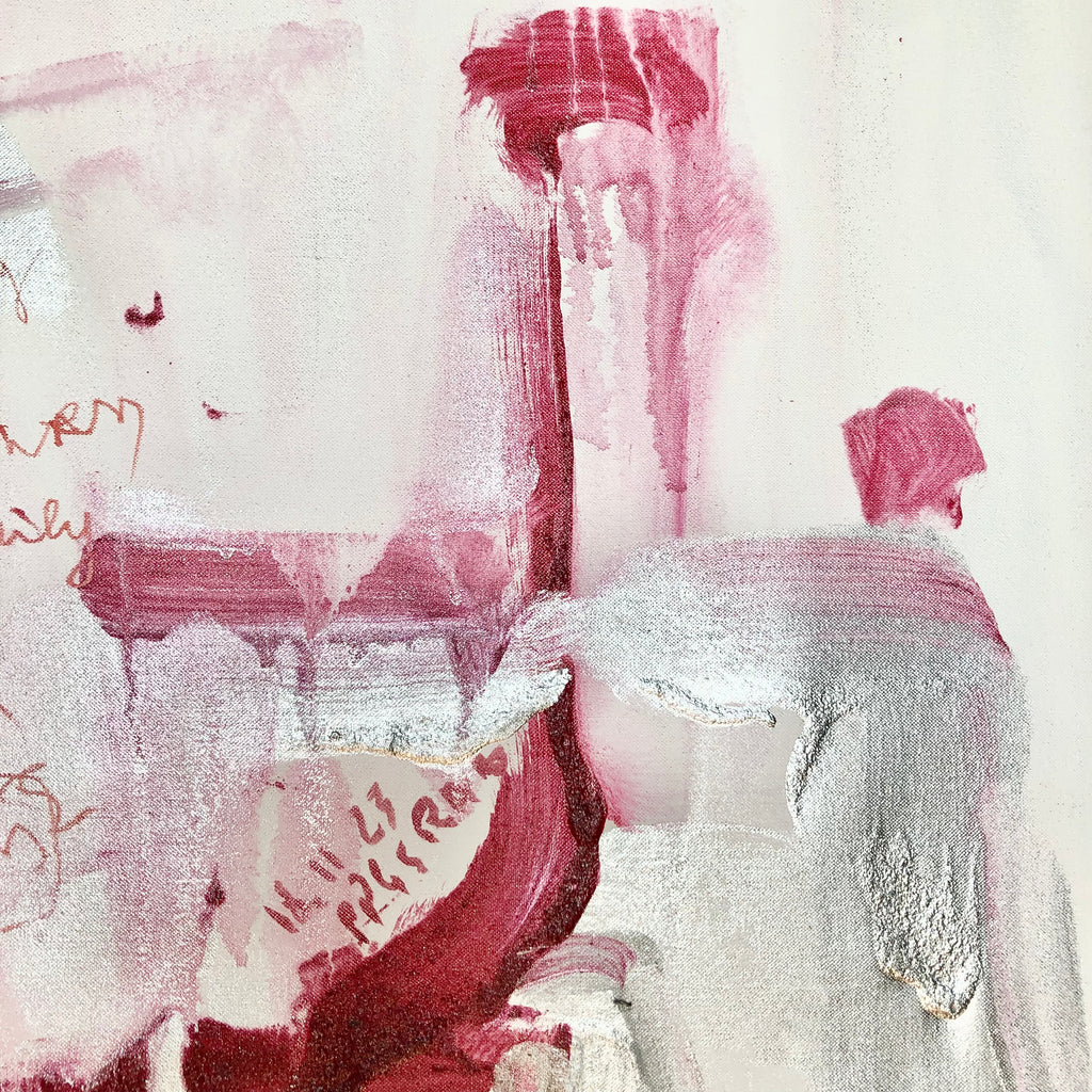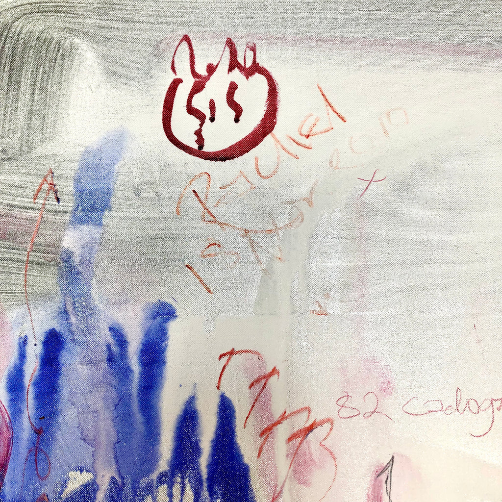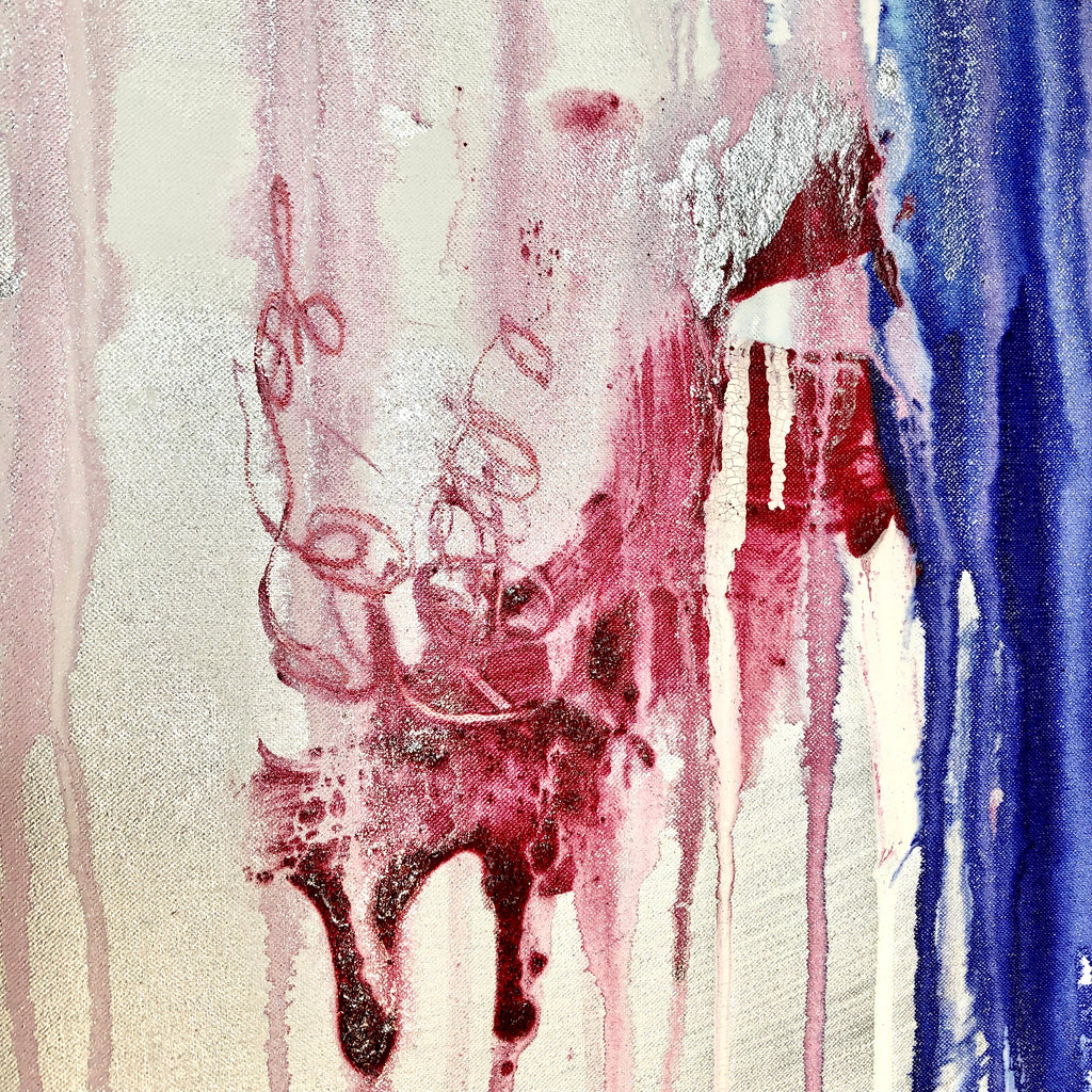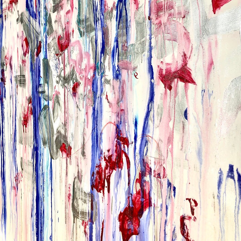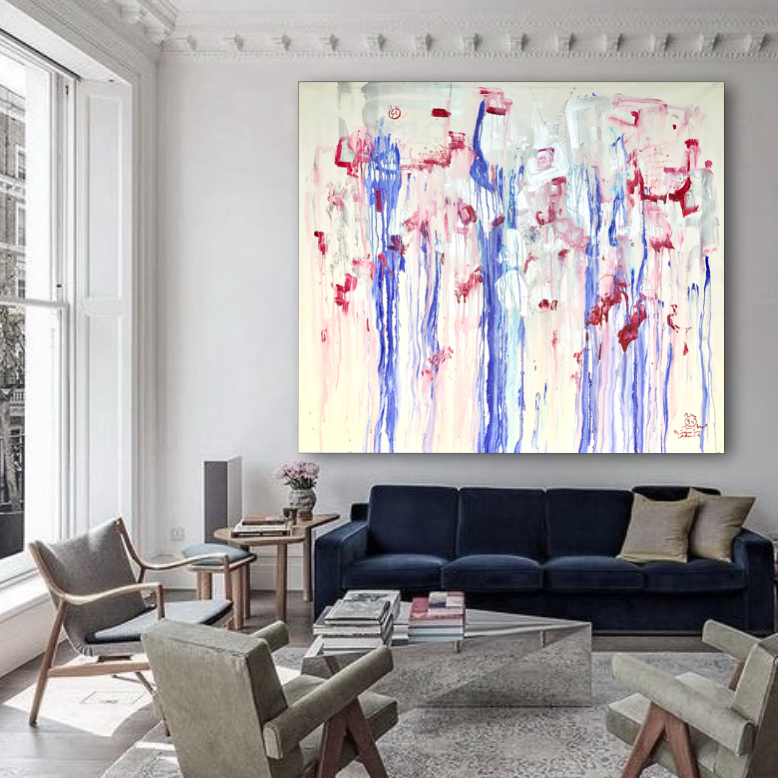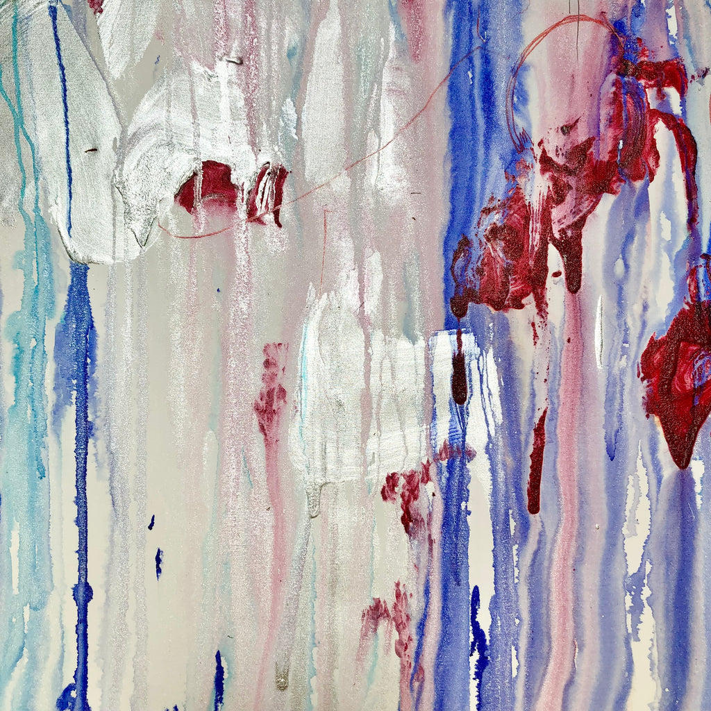 … Even in this pictures you can see how the silver can change in the same canvas from grey to white, just because of the light in the room or gallery. You have more than one impression in front of the canvas, depending on the weather and the moment of the day. A new kind of impressionism proposed by the contemporary painter James Arax. James was inspired by a Londonian fashionista. She has a great look with a beautiful dress and incredible red shoes. This painting was realized in his London studio. This painting is representative of James’s Open Flow technique : drips in purple-blue, light and dark pink. The details evoke her stunning colored dress.