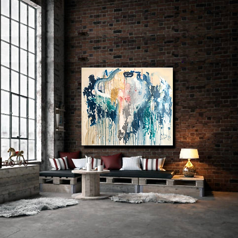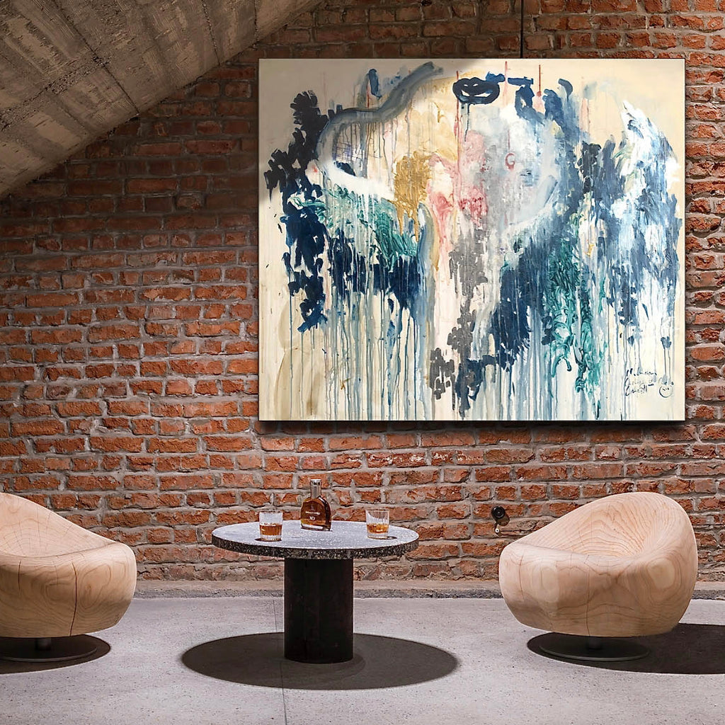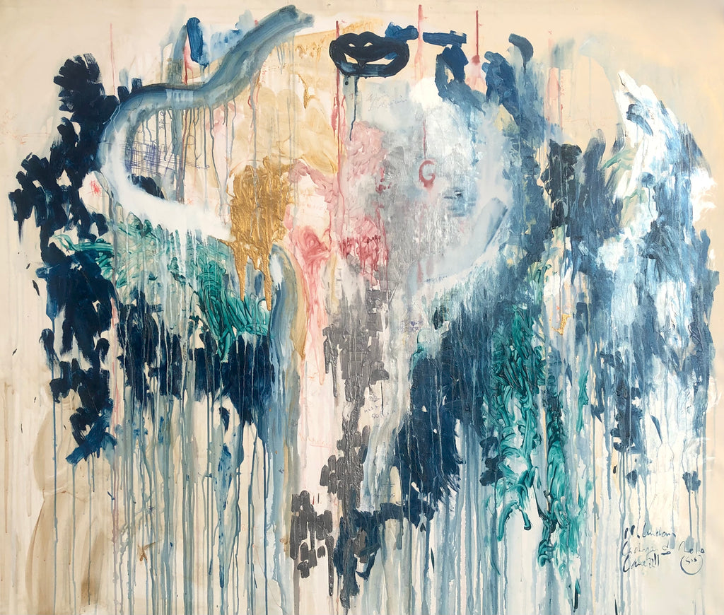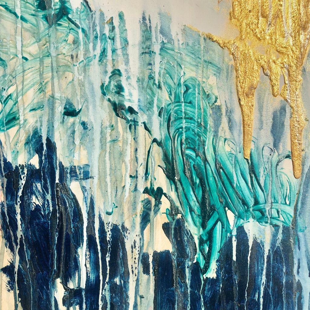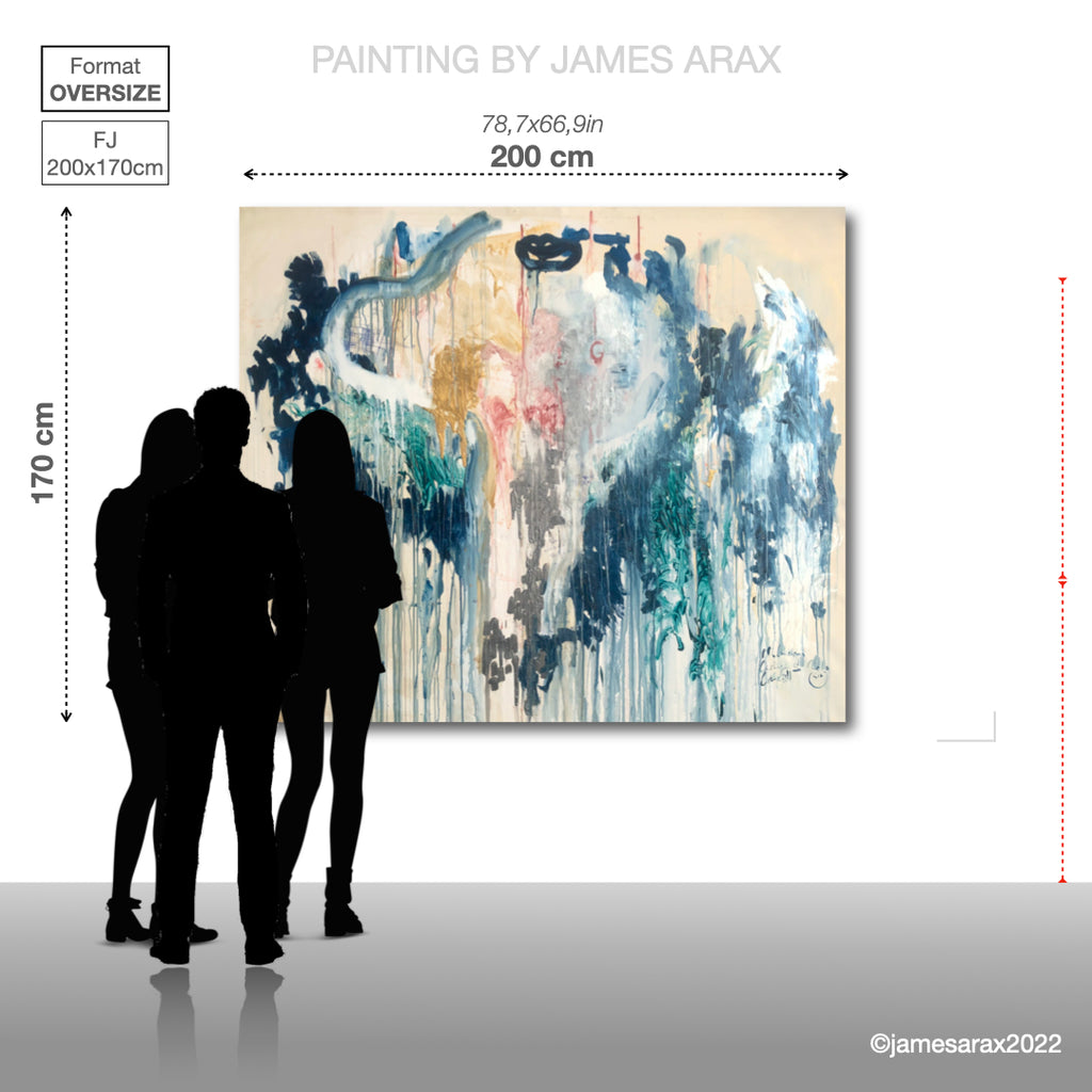 This XL painting is inspired by a French business man who works in Africa and in London where James met him. It’s just amazing as the shape of Africa emerges from the drips of James. The color palette is beautiful with these dark blues and turquoises contrasting with the golden and bright salient elements…