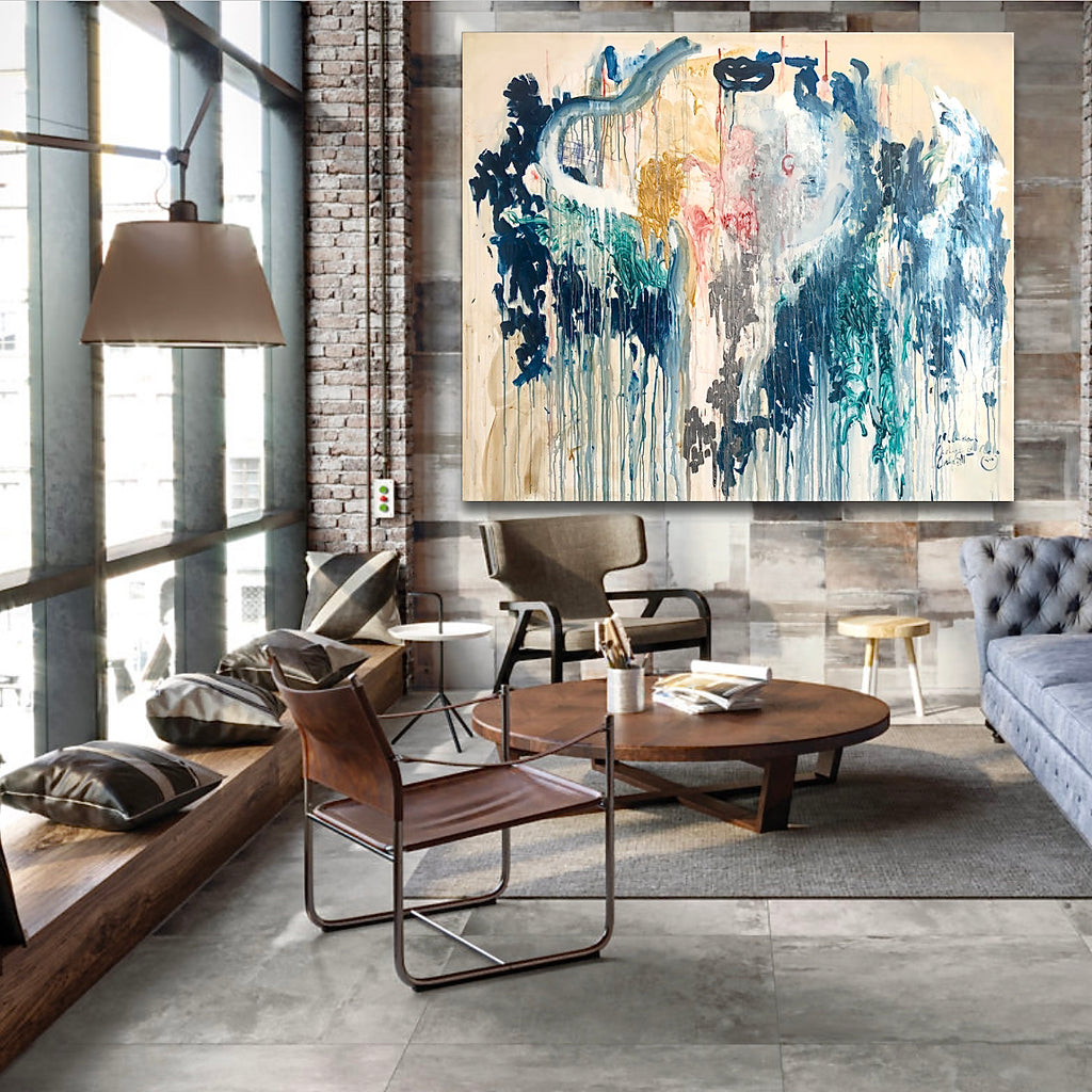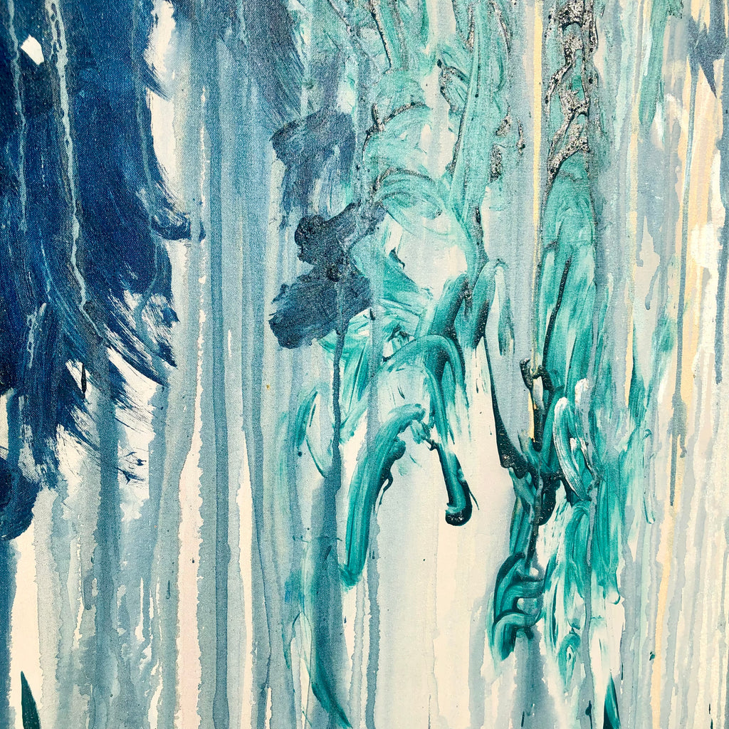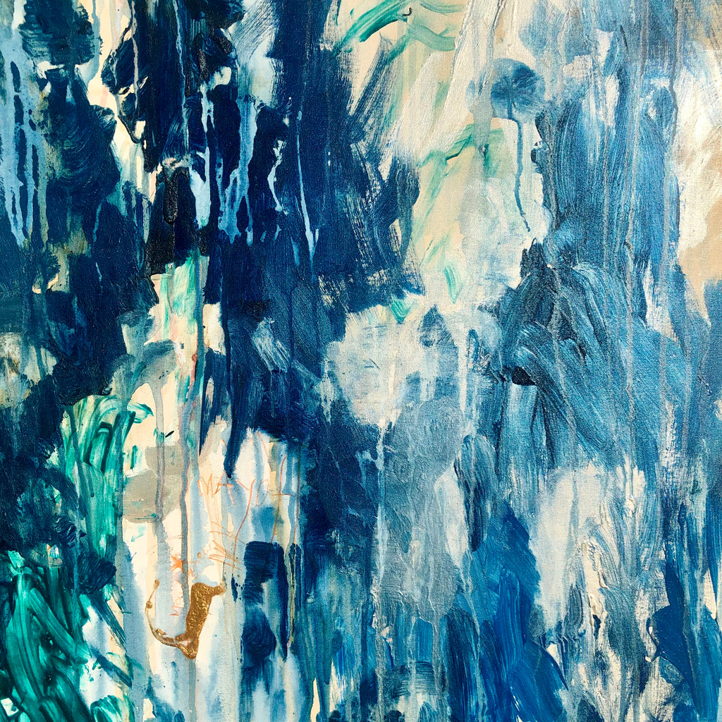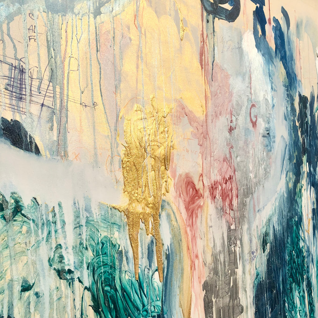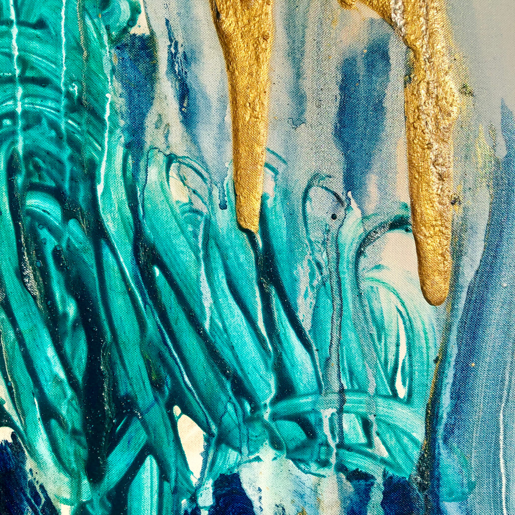 This XL painting is inspired by a French business man who works in Africa and in London where James met him. It’s just amazing as the shape of Africa emerges from the drips of James. The color palette is beautiful with these dark blues and turquoises contrasting with the golden and bright salient elements…
