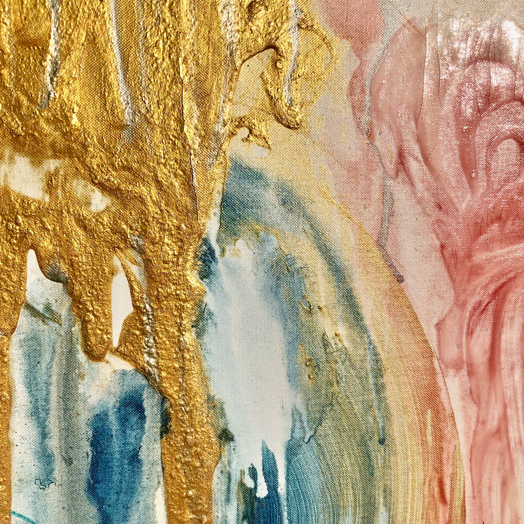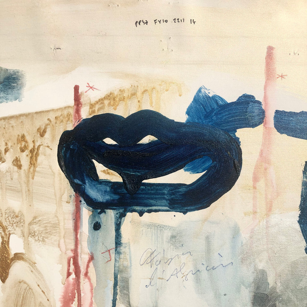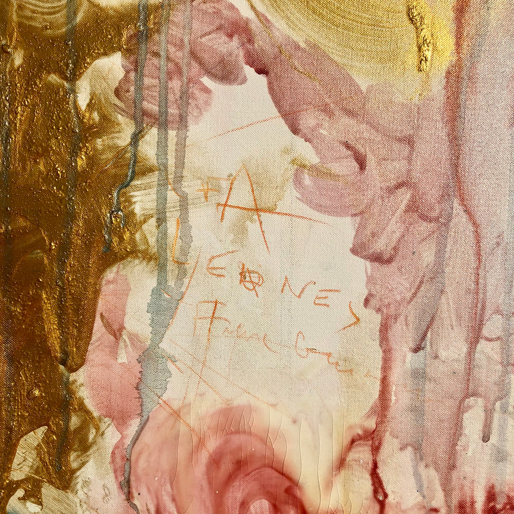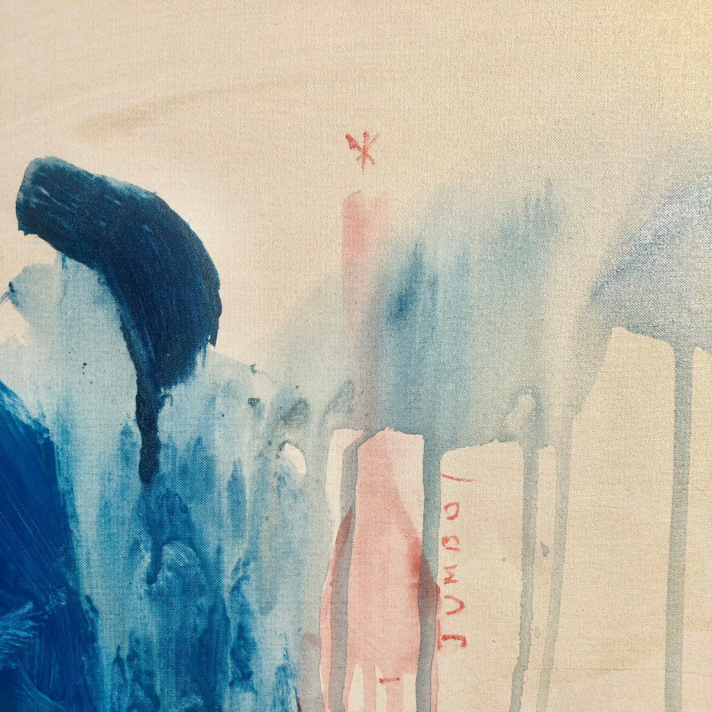 This XL painting is inspired by a French business man who works in Africa and in London where James met him. It’s just amazing as the shape of Africa emerges from the drips of James. The color palette is beautiful with these dark blues and turquoises contrasting with the golden and bright salient elements…