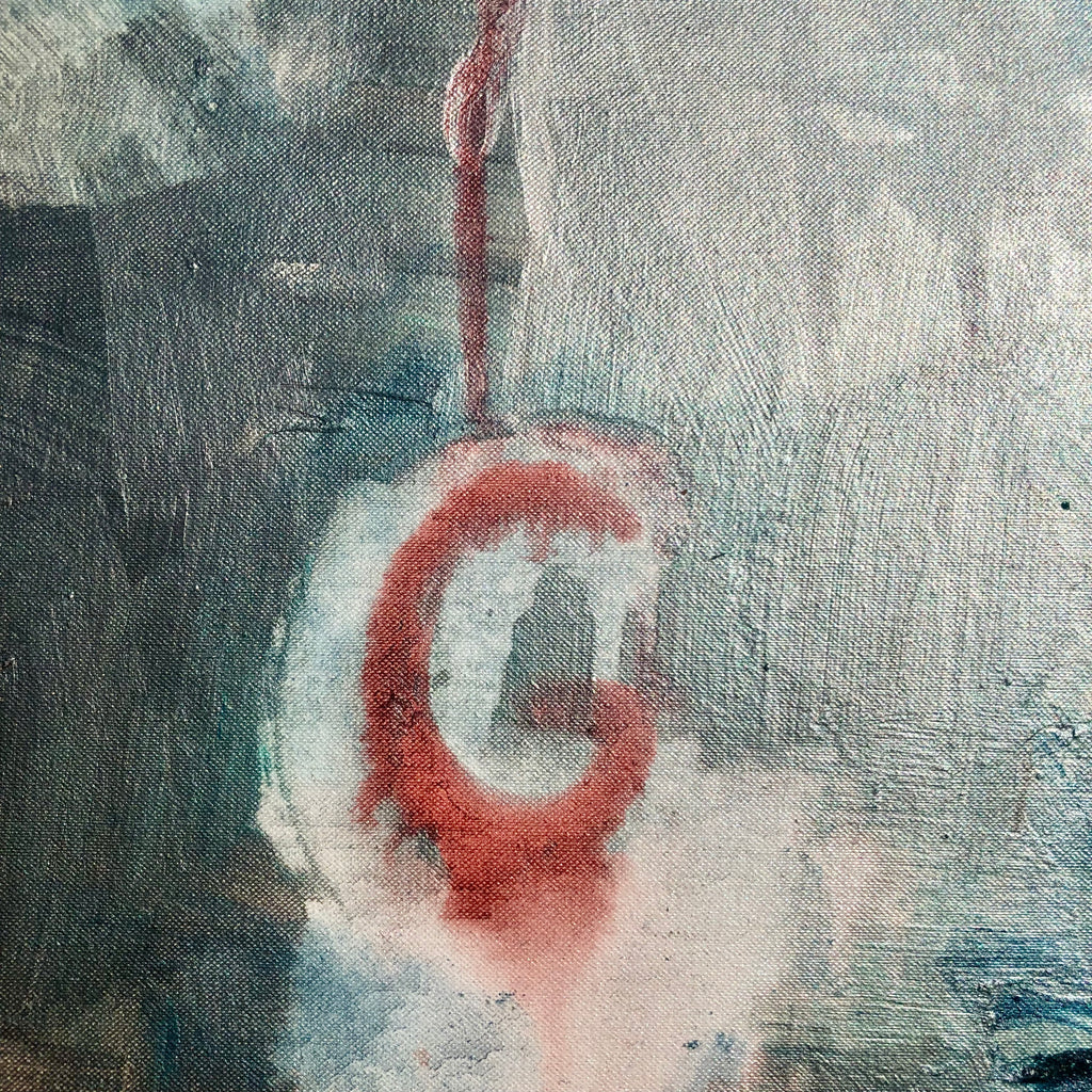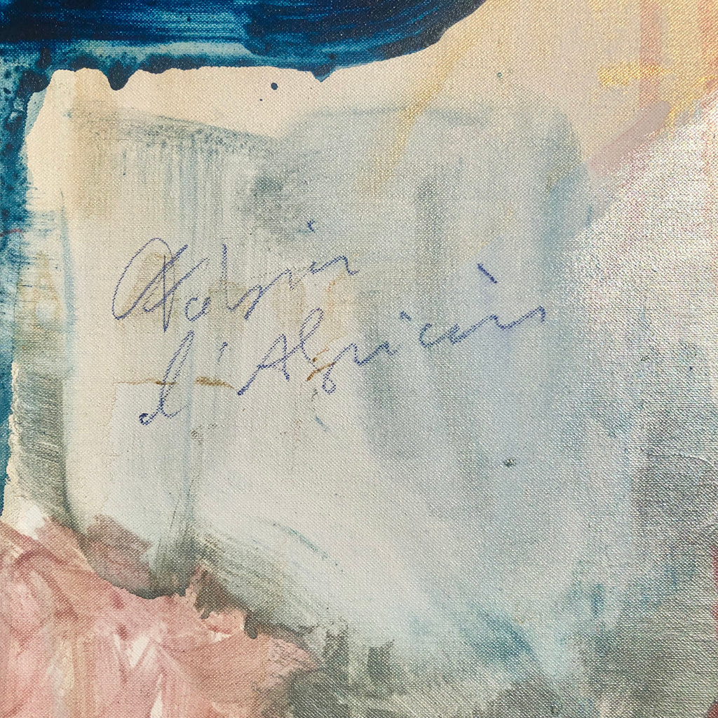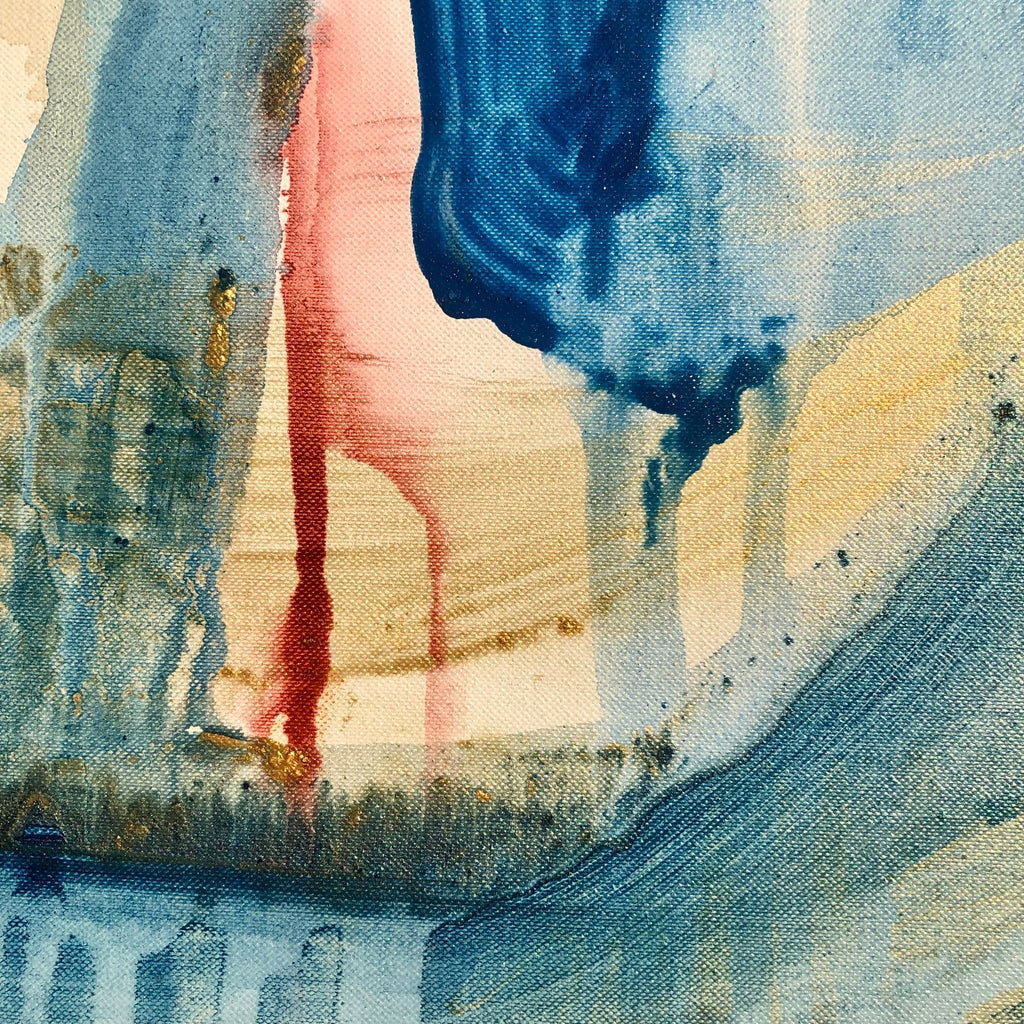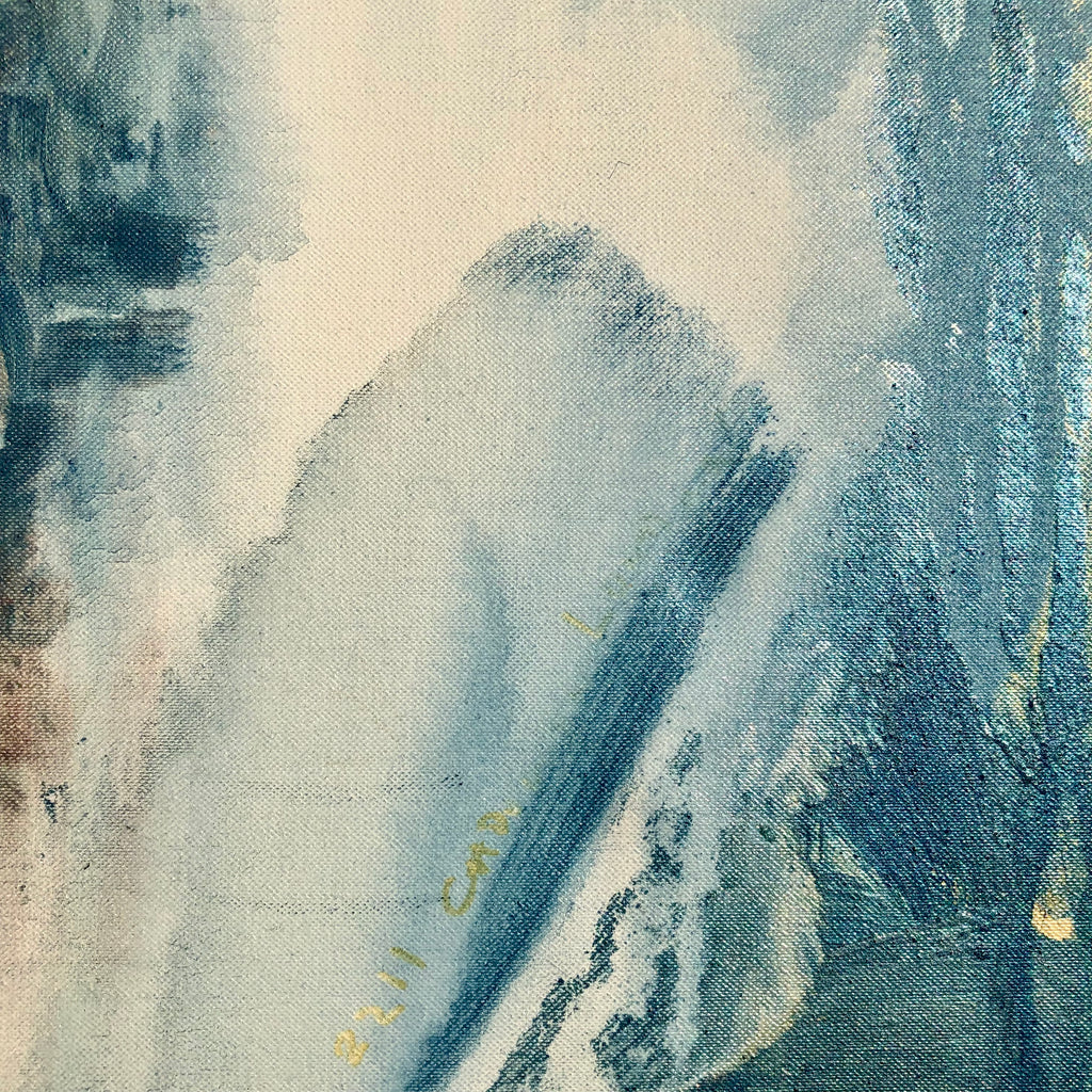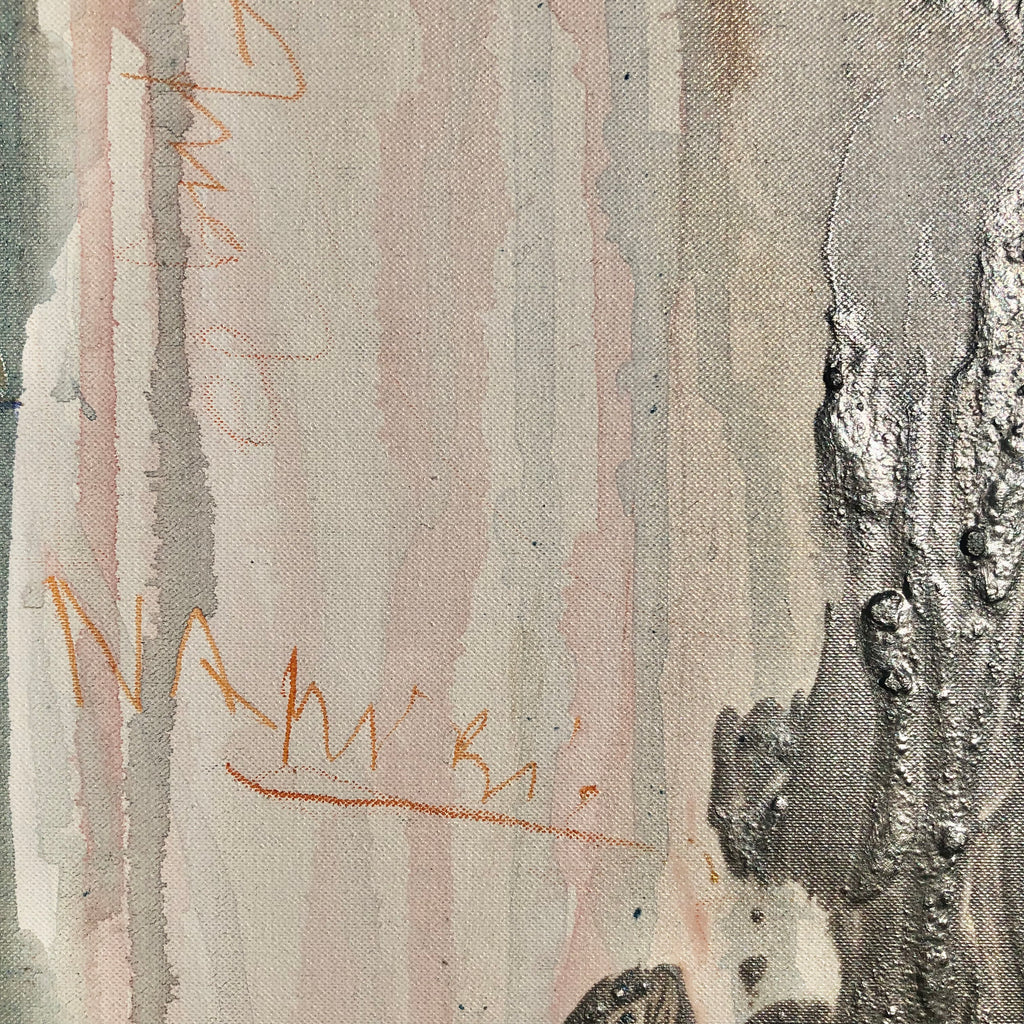 This XL painting is inspired by a French business man who works in Africa and in London where James met him. It’s just amazing as the shape of Africa emerges from the drips of James. The color palette is beautiful with these dark blues and turquoises contrasting with the golden and bright salient elements…