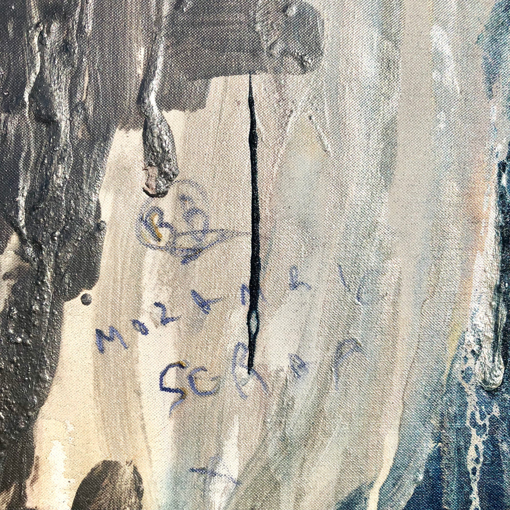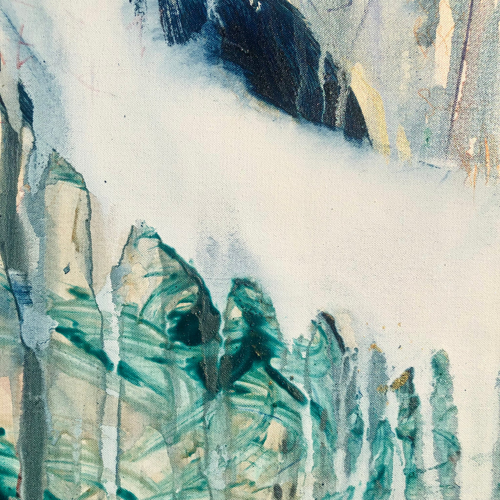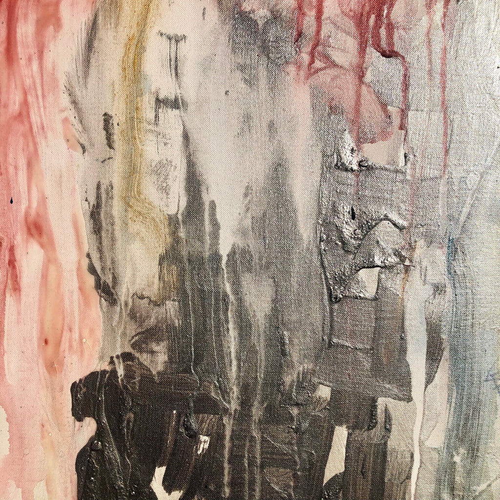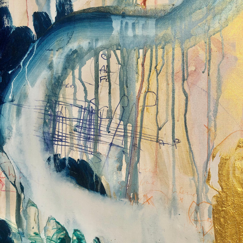 Mixed technique: Colored pigments, color pencil, glue, ink on canvas
