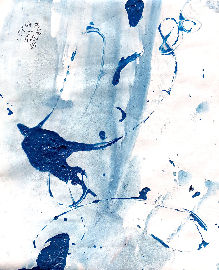 Mixed technique: Colored pigments, glue, blue ink on paper