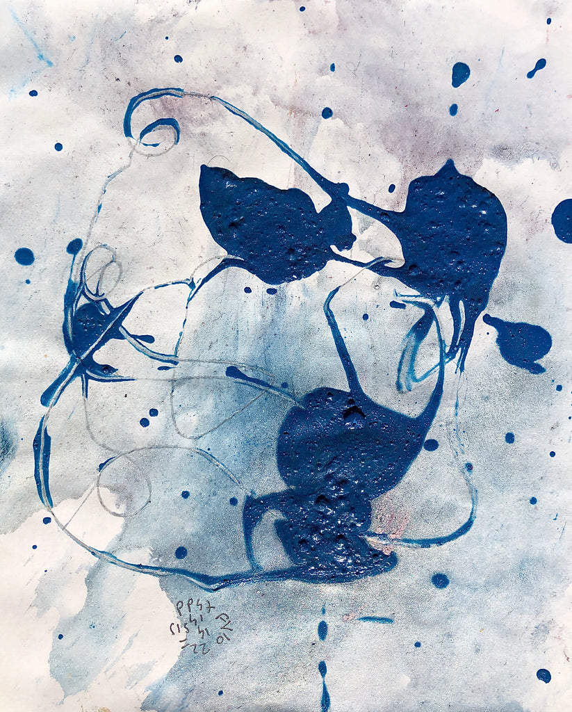 I always make Xsmall paintings on paper after the large size canvas « Presence painting ». I use the liquid paint left of the large canvas. It is a way of physically linking these two types of creations.This painting on paper is associated with the performance Presence painting n°47. James imagines a powerful and lush nature, visible in the accumulation of colors on the canvas. He imagines a territory where you can get lost...