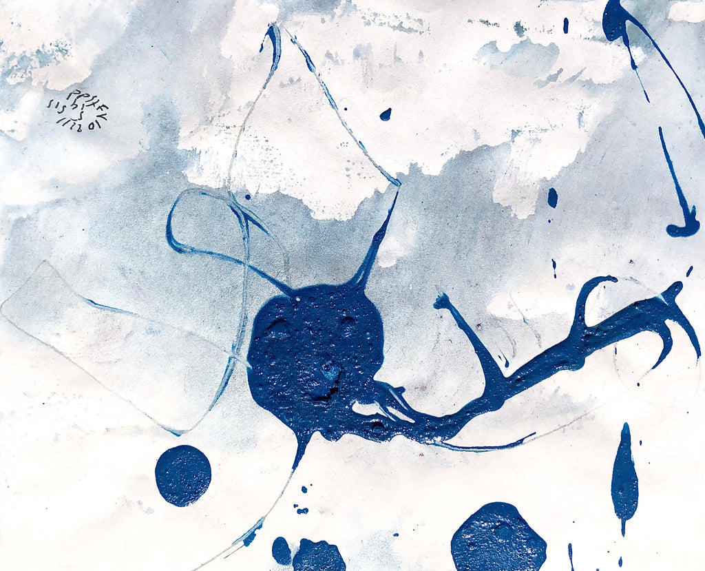 I always make Xsmall paintings on paper after the large size canvas « Presence painting ». I use the liquid paint left of the large canvas. It is a way of physically linking these two types of creations.This painting on paper is associated with the performance Presence painting n°47.James says that this painting is lush. He imagines a powerful and lush nature, visible in the accumulation of colors on the canvas. He imagines a territory where you can get lost...