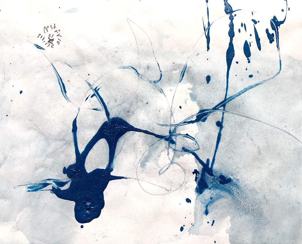 Mixed technique: colored pigments, glue, Blue ink on paper