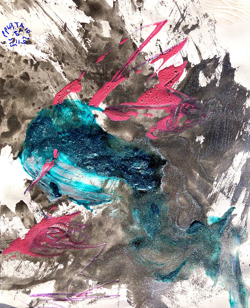 "I always make Xsmall paintings on paper after the large size canvas Presence painting*. I use the liquid paint left of this large canvas to make the drawings. It is a way of physically linking these two types of creations."