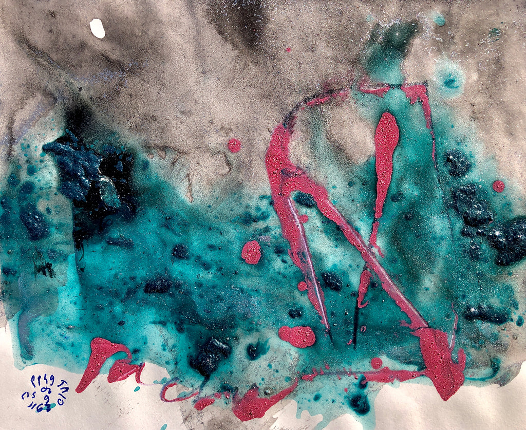 "I always make Xsmall paintings on paper after the large size canvas Presence painting*. I use the liquid paint left of this large canvas to make the drawings. It is a way of physically linking these two types of creations."