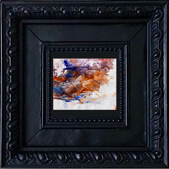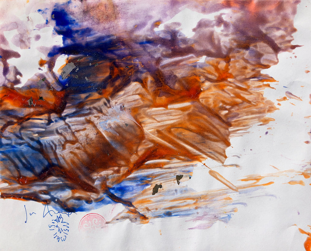 PP51 XS05 - James is a talented colorist as critics say. This XS painting on paper reflects the mix technique of James with both solid and liquid elements. A very contrasted palette of blues, purples and oranges playing with the white surface of the paper.