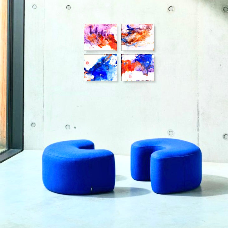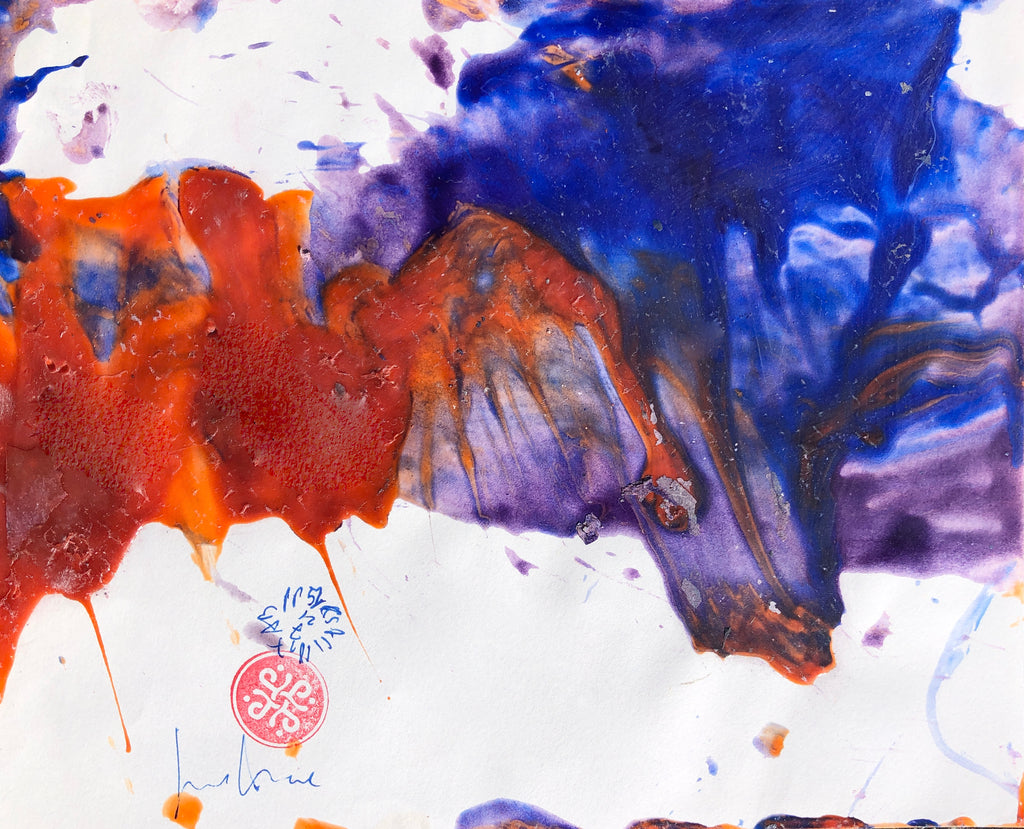 PP51 XS07 - This XS painting on paper reflects the mix technique of James with both solid and liquid elements. A very contrasted palette of oranges and blues playing with the white surface of the paper.