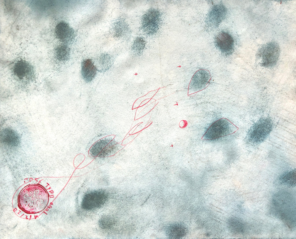Mixed technique: Colored pigments, red pencil & ink on paper