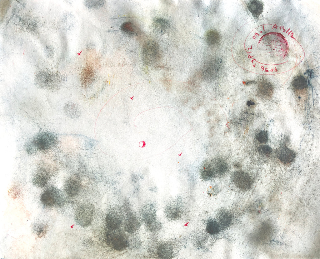 Many traces on paper like sniper bullet holes. Paper full of energy, concentration of traces, colored background like the mental landscape of the sniper. Here, stray bullets in the universe red orbit line, red moon, grey-green and clear background...