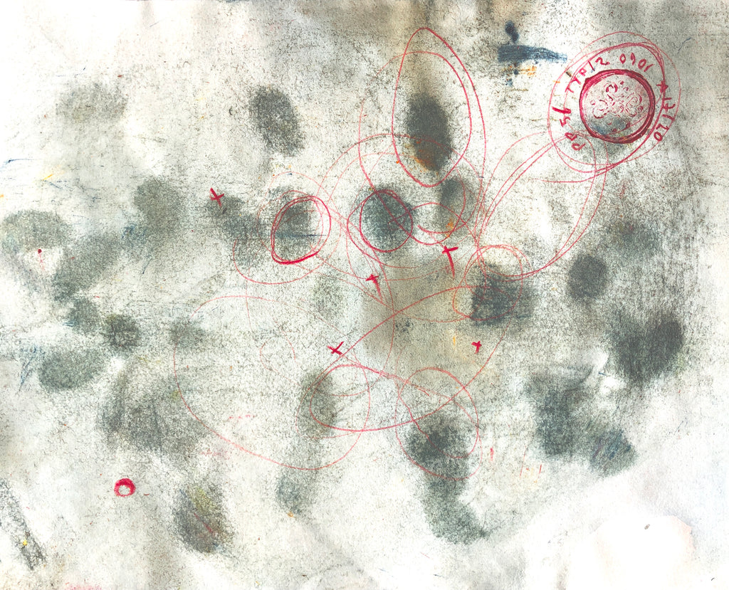 Mixed technique: Colored pigments, red pencil & ink on paper