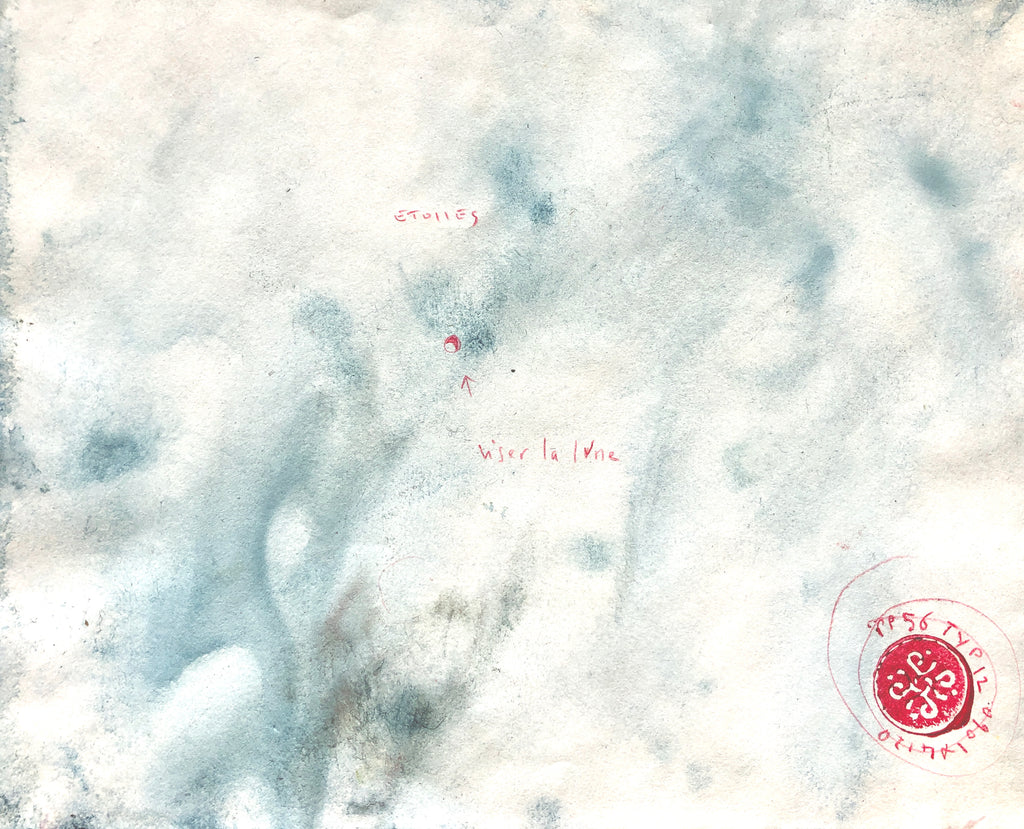 Many traces on paper like sniper bullet holes. Paper full of energy, concentration of traces, colored background like the mental landscape of the sniper. Here the univers, « aim for the moon », blue and clear background. arks...