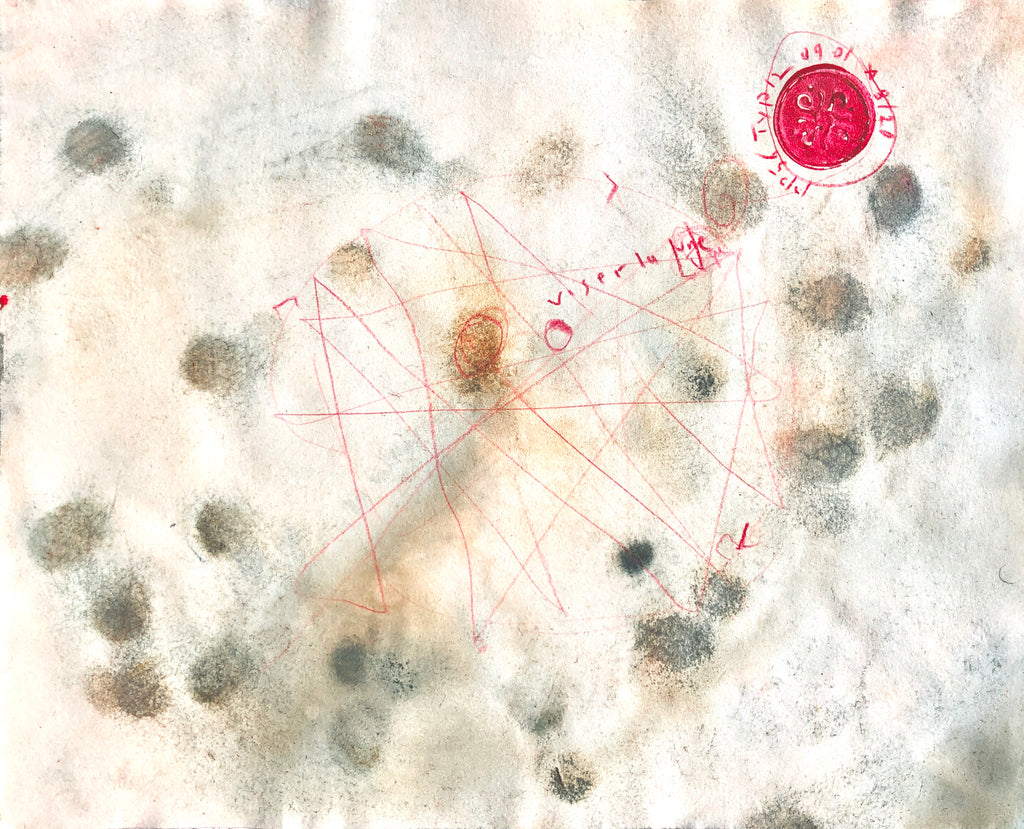 Mixed technique: Colored pigments, red pencil & ink on paper
