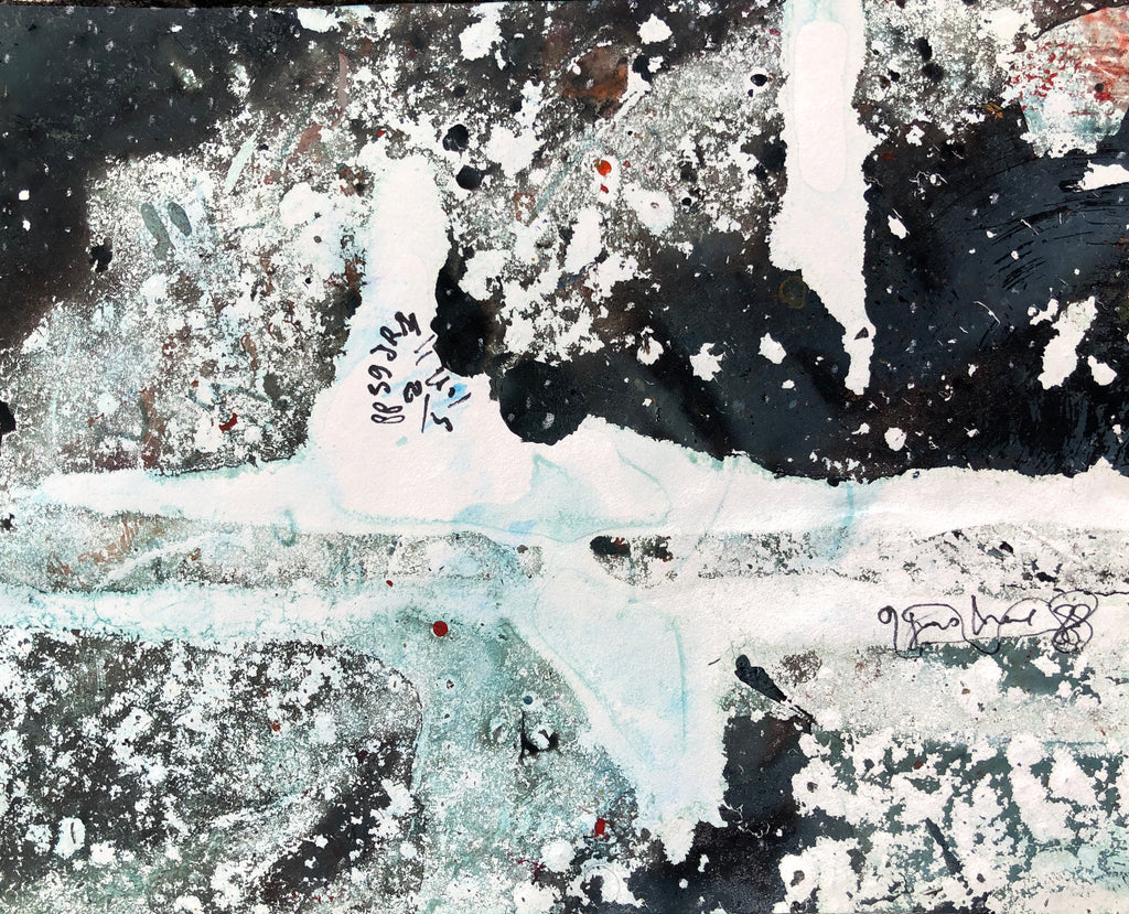 Start to travel in these large landscapes where each pictorial accident tell a story. On this horizontal paper, there is a large white horizontal fault in black rock...