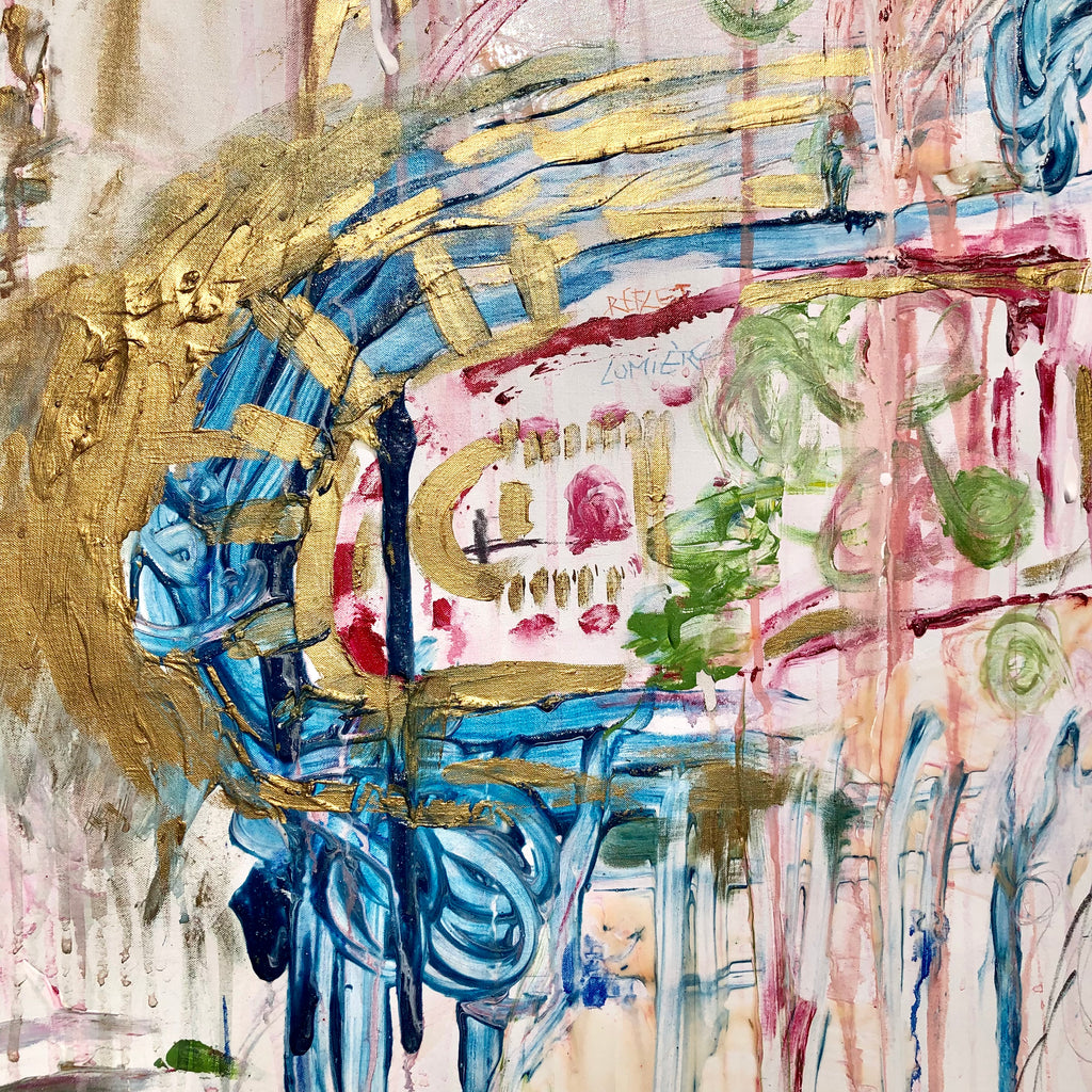 « THE WRITER FROM NORWAY » XL painting. A lot of space as an ode to the wild Norwegian landscapes, breathtaking fjords, waterfalls… Dancing colors give a spring spirit like the « Ode to Joy » by Beethoven.
