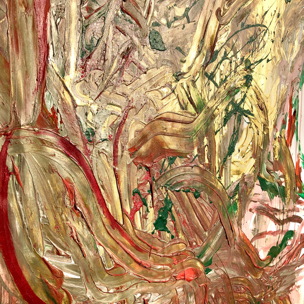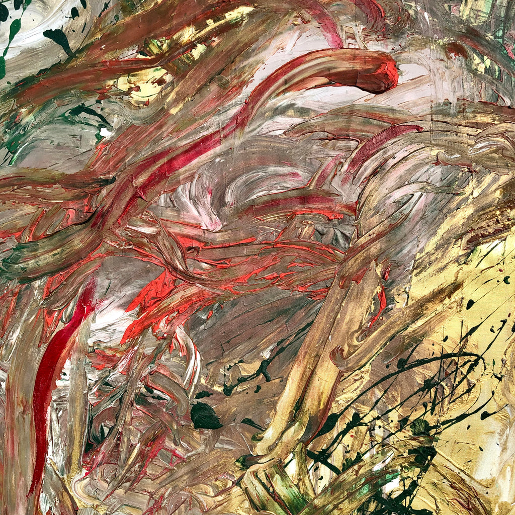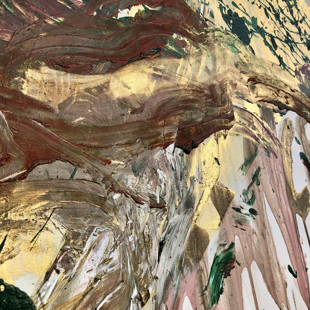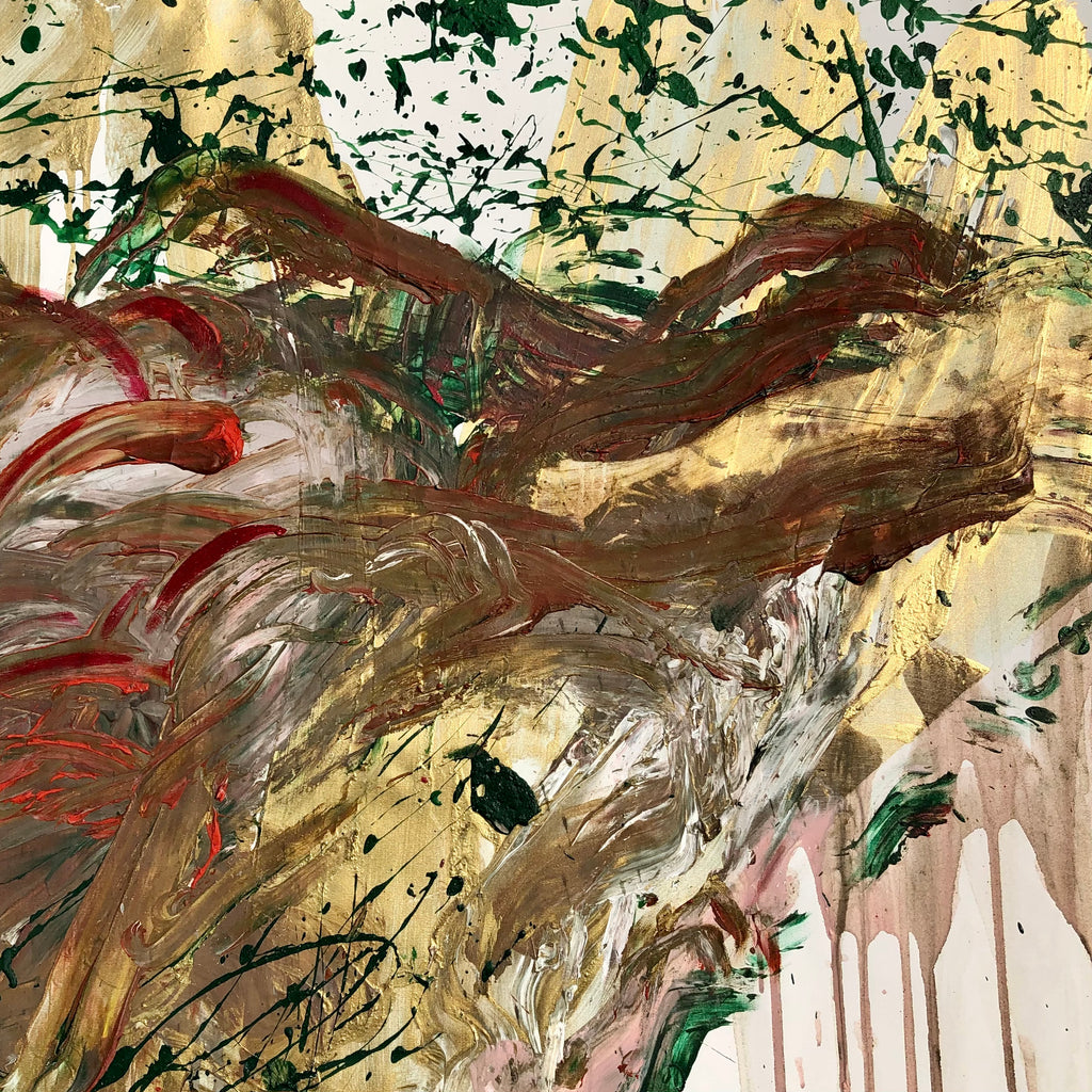James plays with the white of the canvas, golden pigments creating new spaces, lights and shapes on the canvas. He uses his special technique to create this movement and strength of the Dragon’s shape.