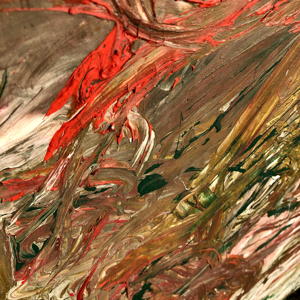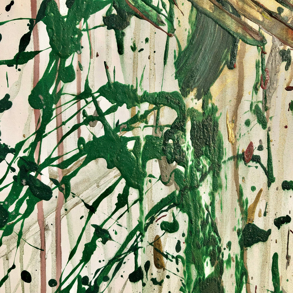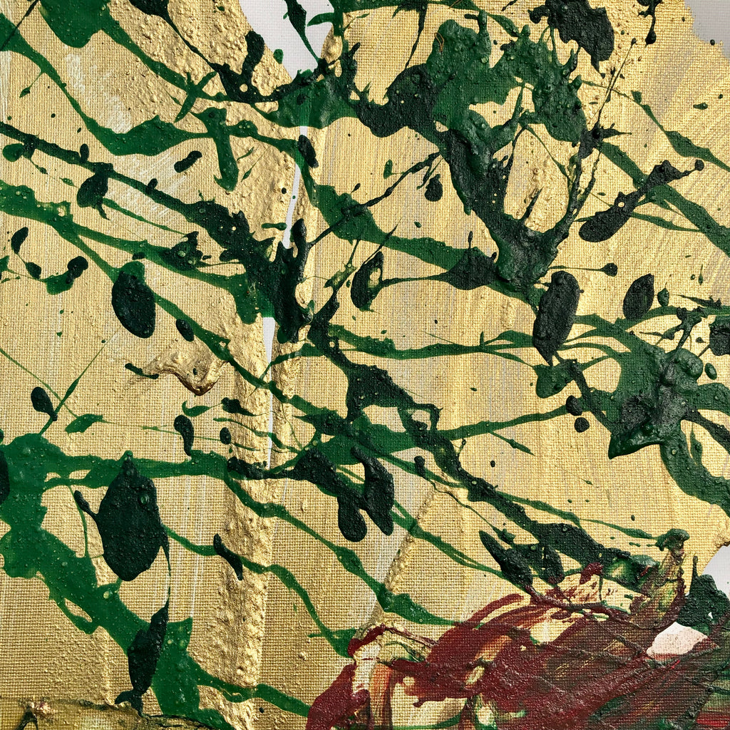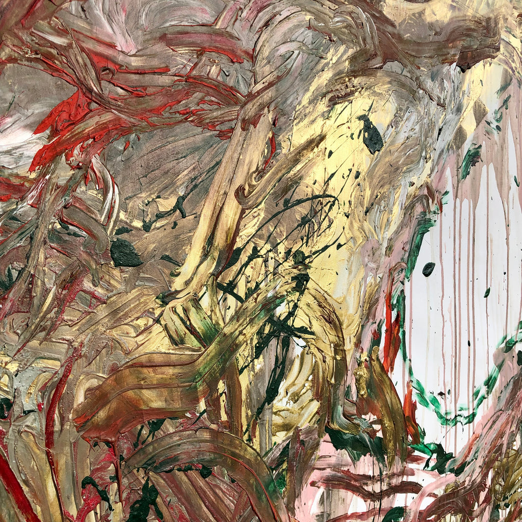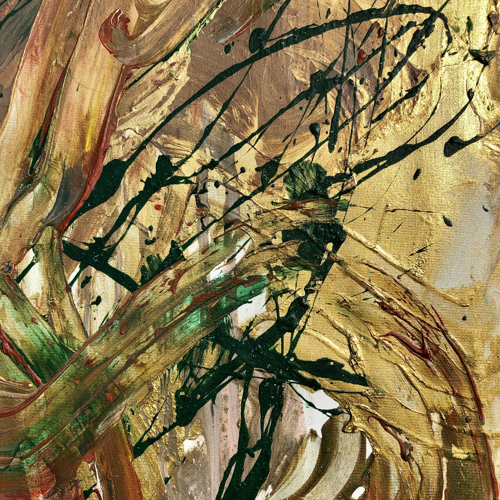 James plays with the white of the canvas, golden pigments creating new spaces, lights and shapes on the canvas. He uses his special technique to create this movement and strength of the Dragon’s shape.