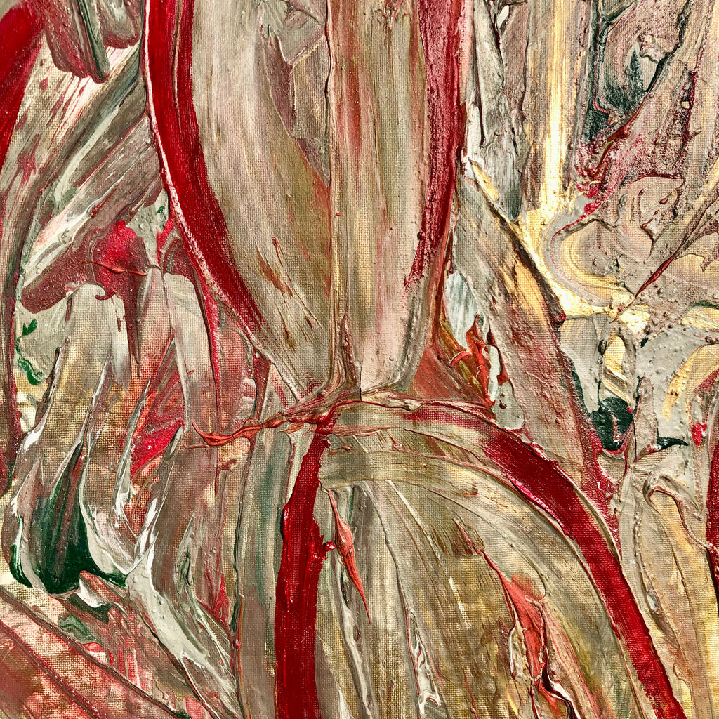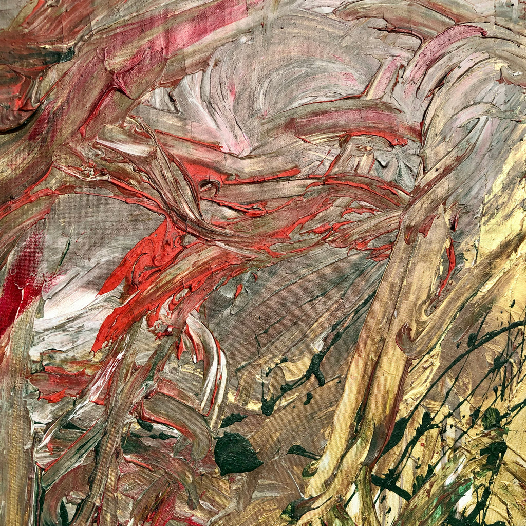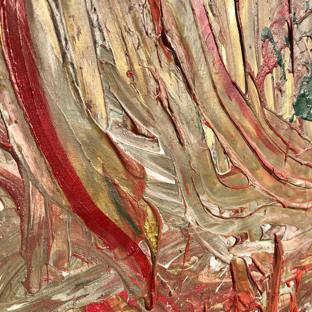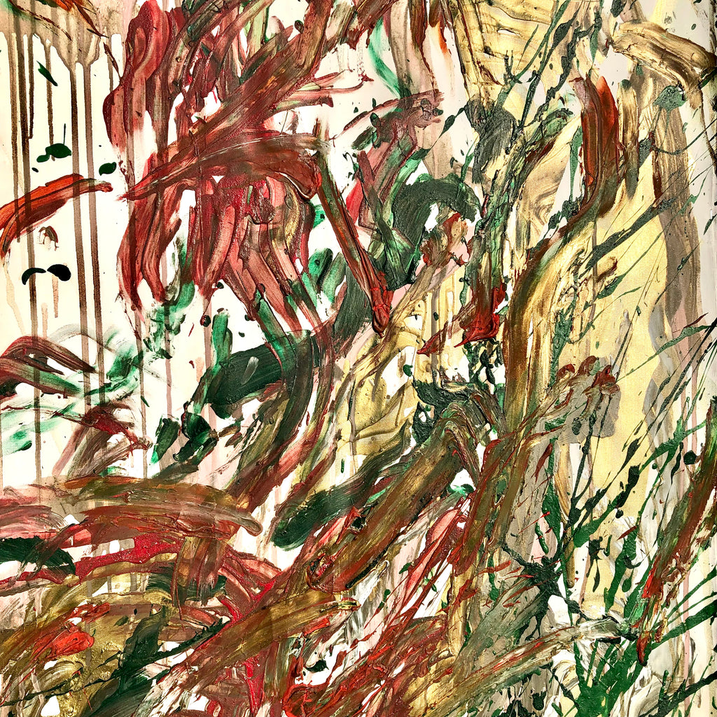 James plays with the white of the canvas, golden pigments creating new spaces, lights and shapes on the canvas. He uses his special technique to create this movement and strength of the Dragon’s shape.