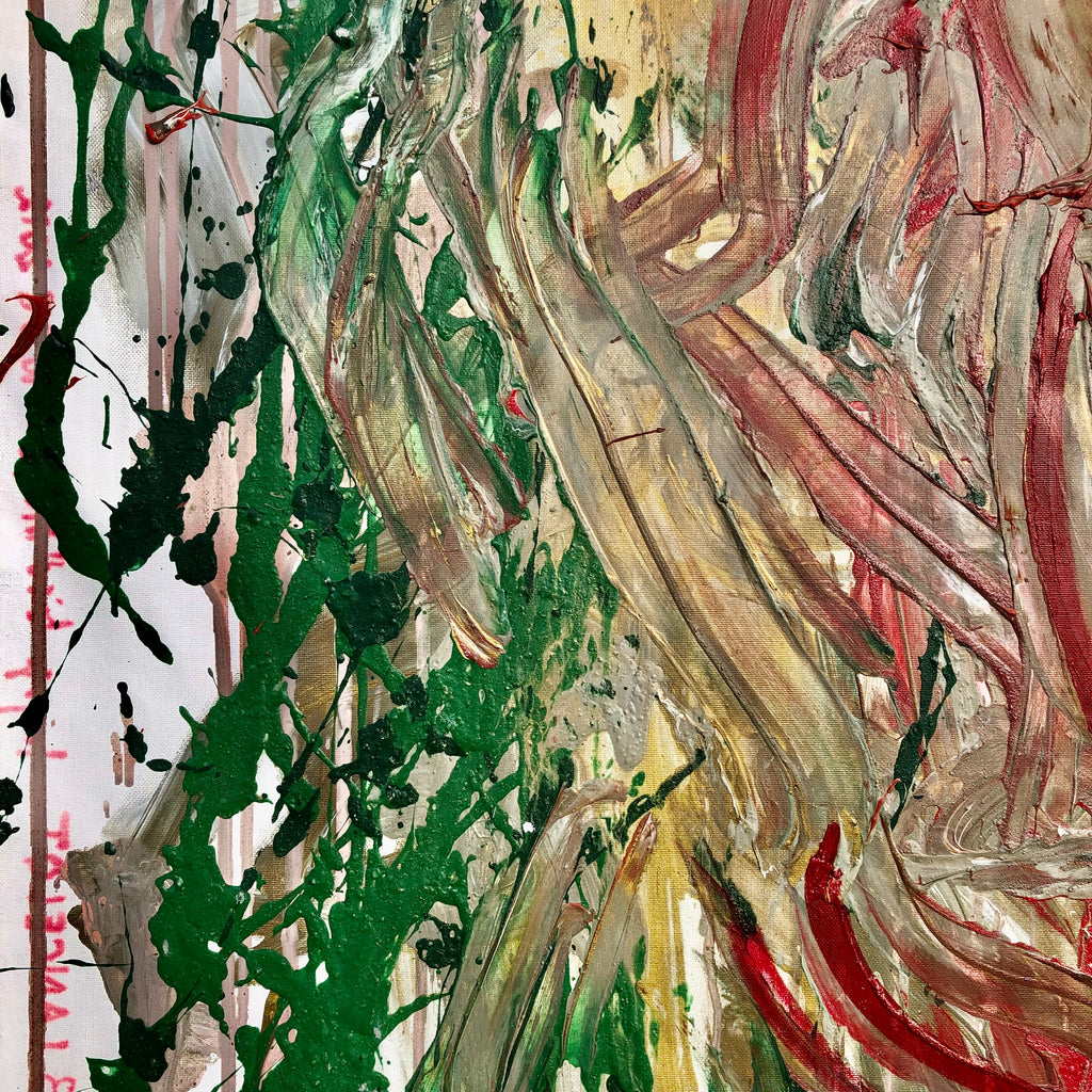 Mixed technique: Colored and silver pigments, color pencil, glue, ink on canvas