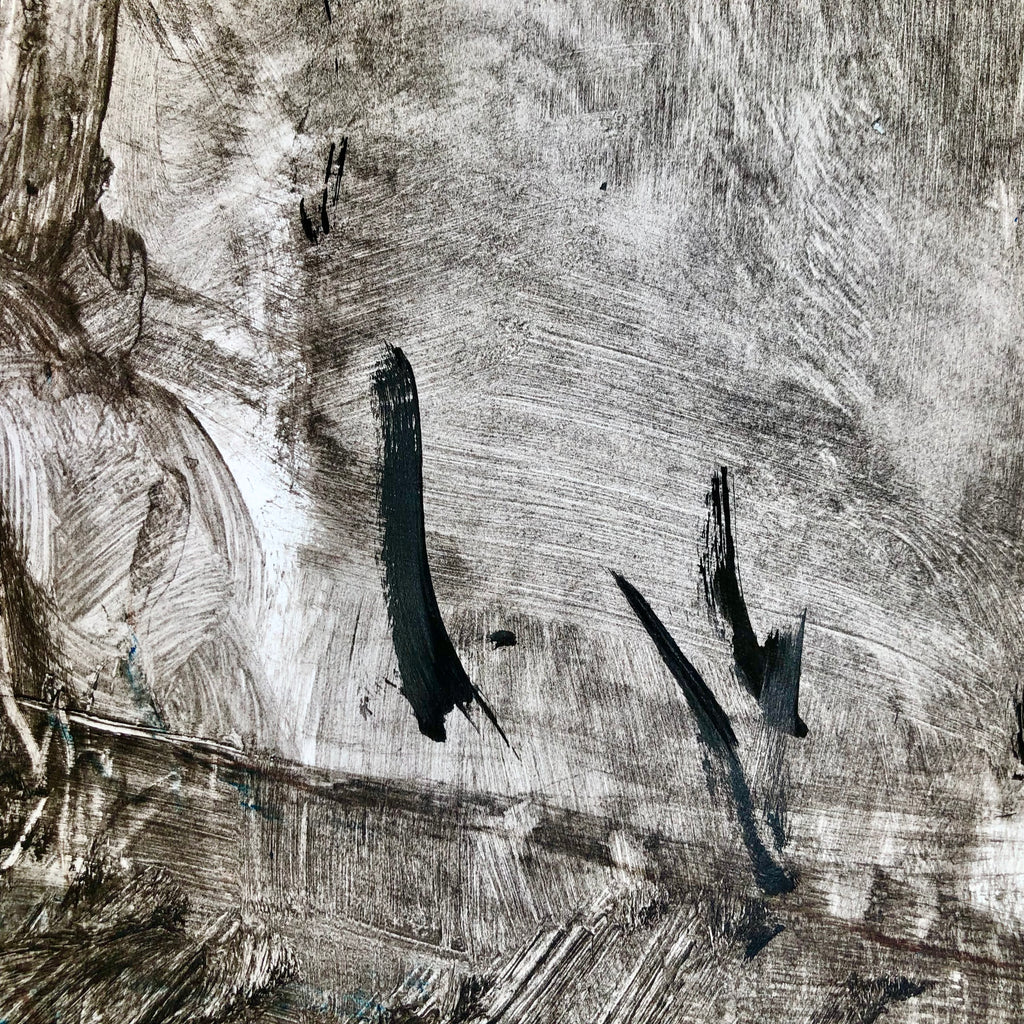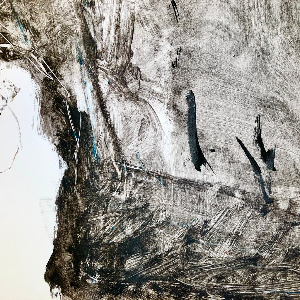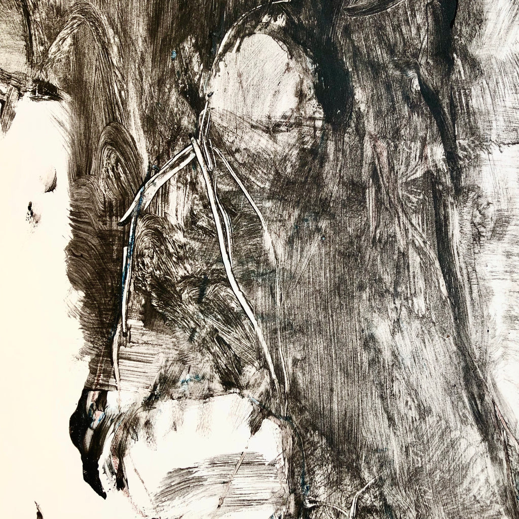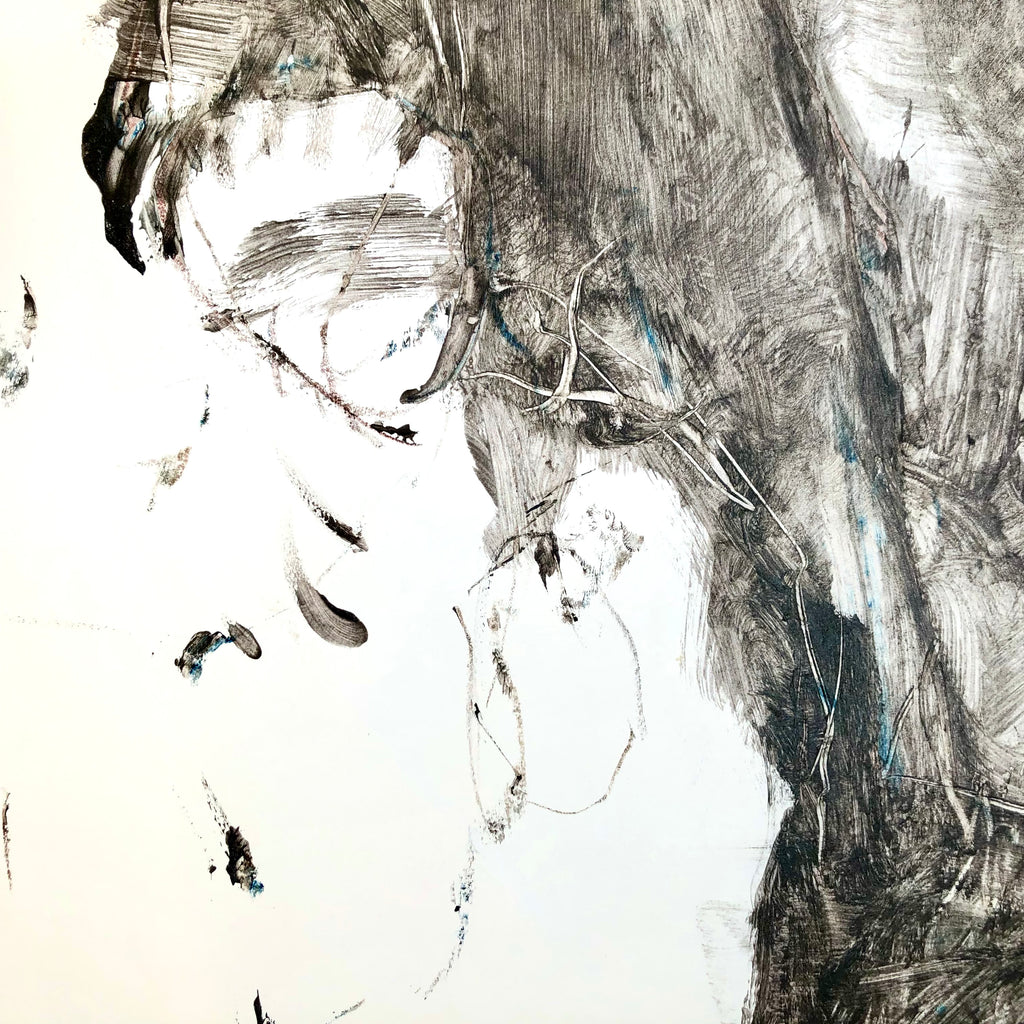 Mixed technique: Glue, black ink, charcoal pencil, colored pencil, on paper