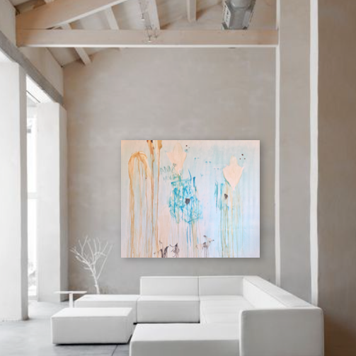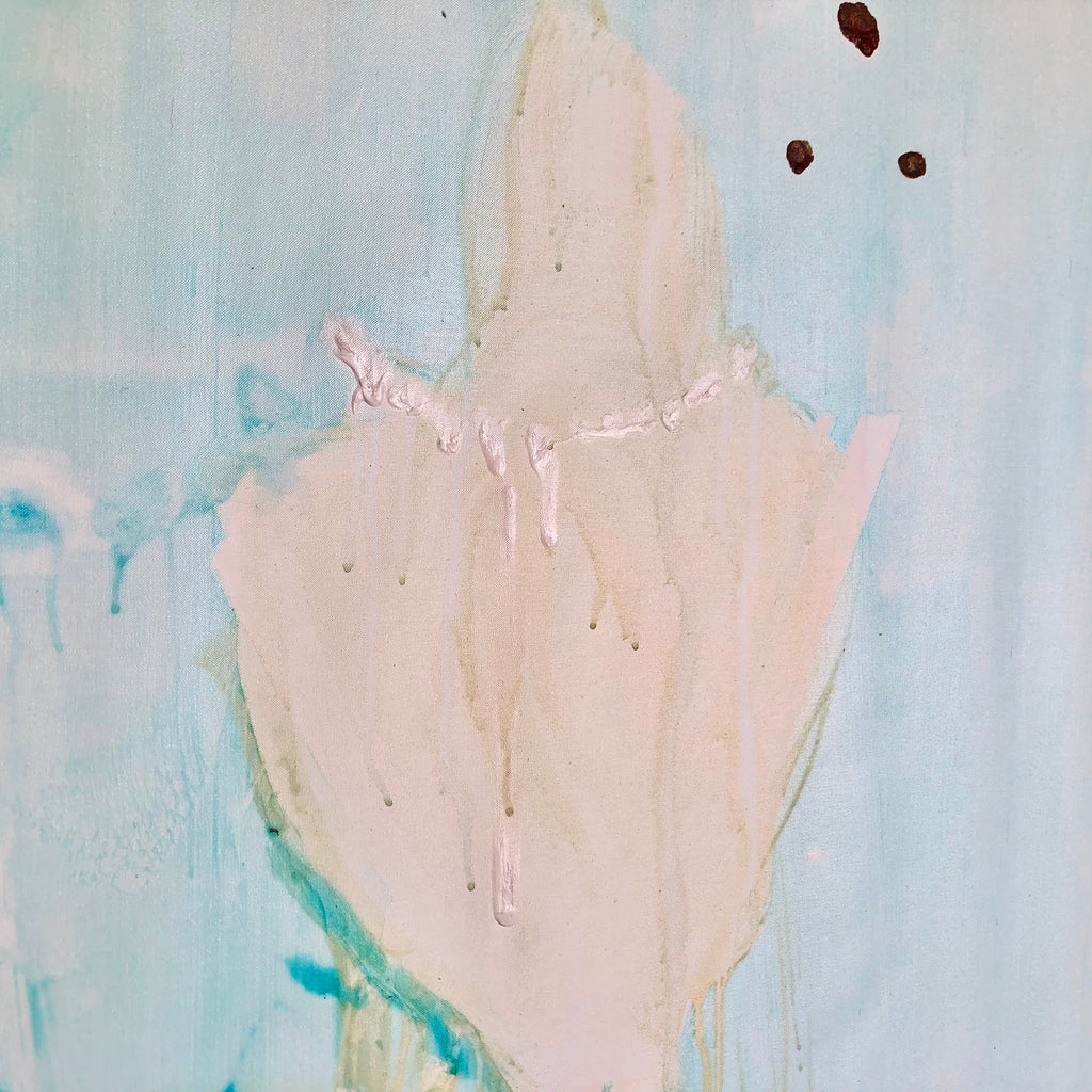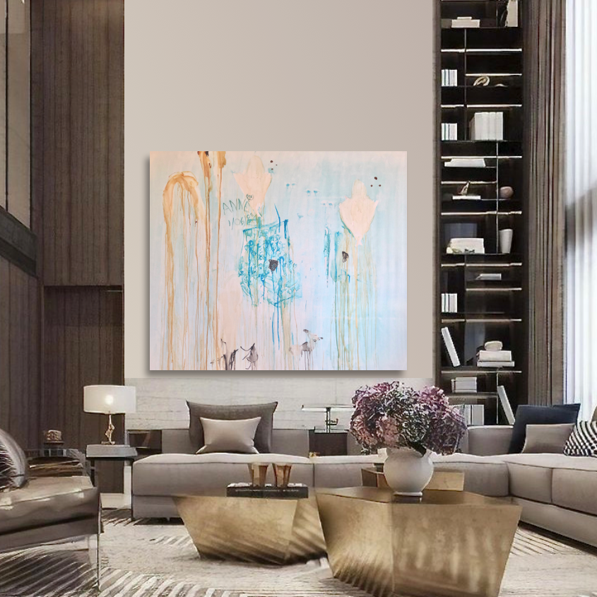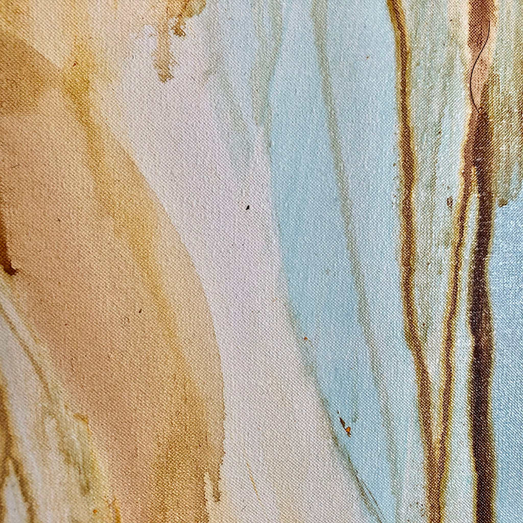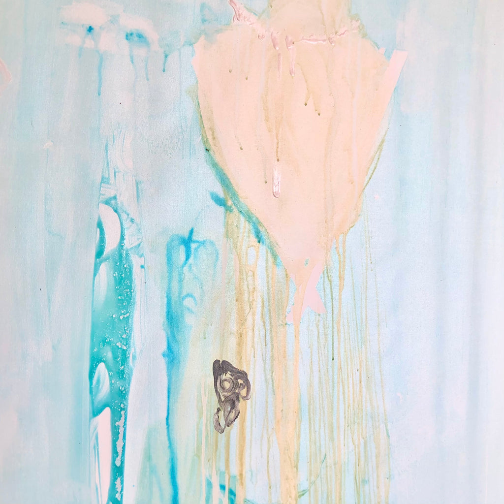 XL Painting of the Presence painting collection. A very soft palette of light blues and cool beiges creates a peaceful atmosphere. The shape in turquoise color evokes the model of the painting session...