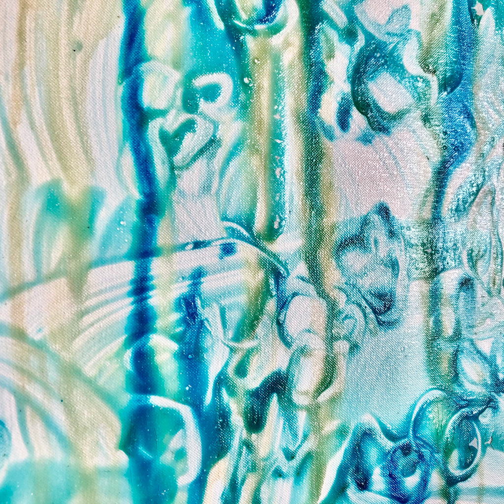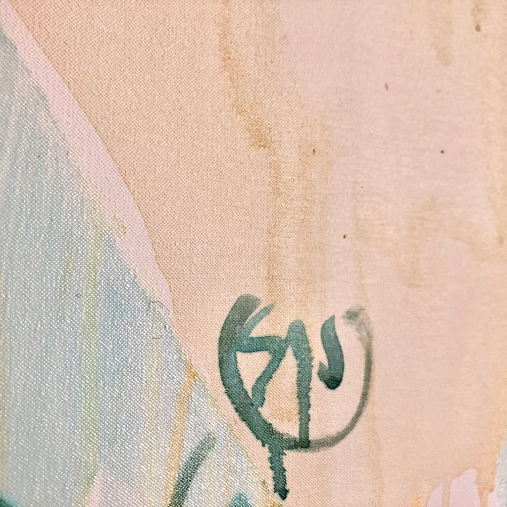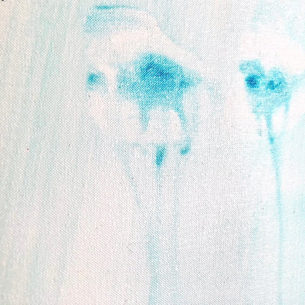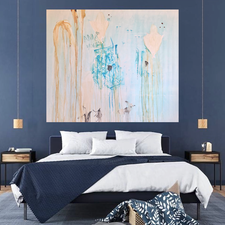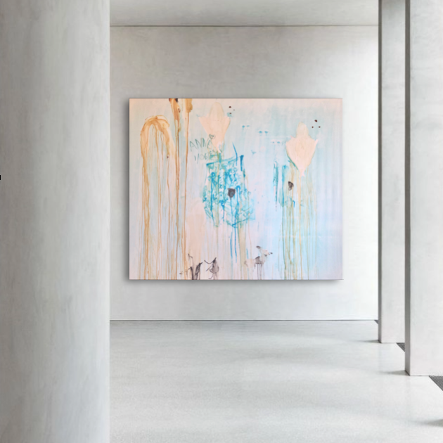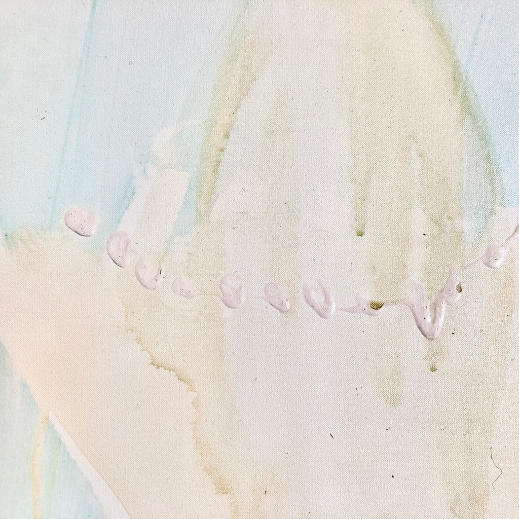 XL Painting of the Presence painting collection. A very soft palette of light blues and cool beiges creates a peaceful atmosphere. The shape in turquoise color evokes the model of the painting session...