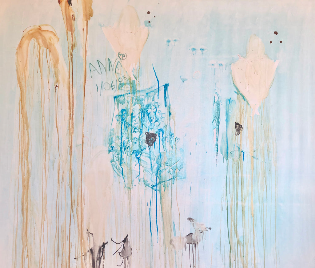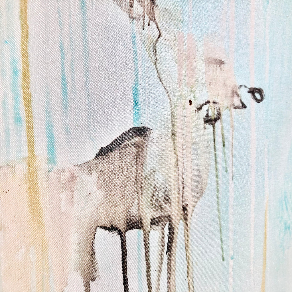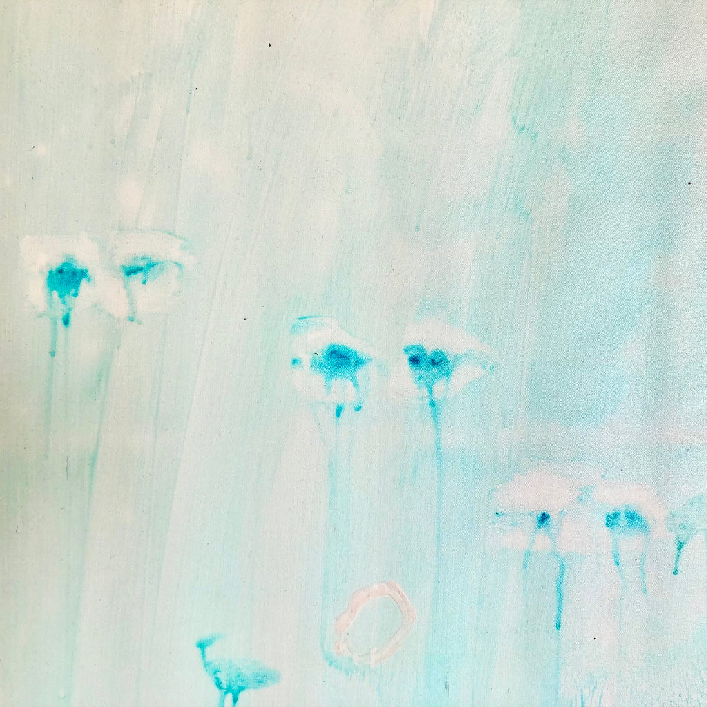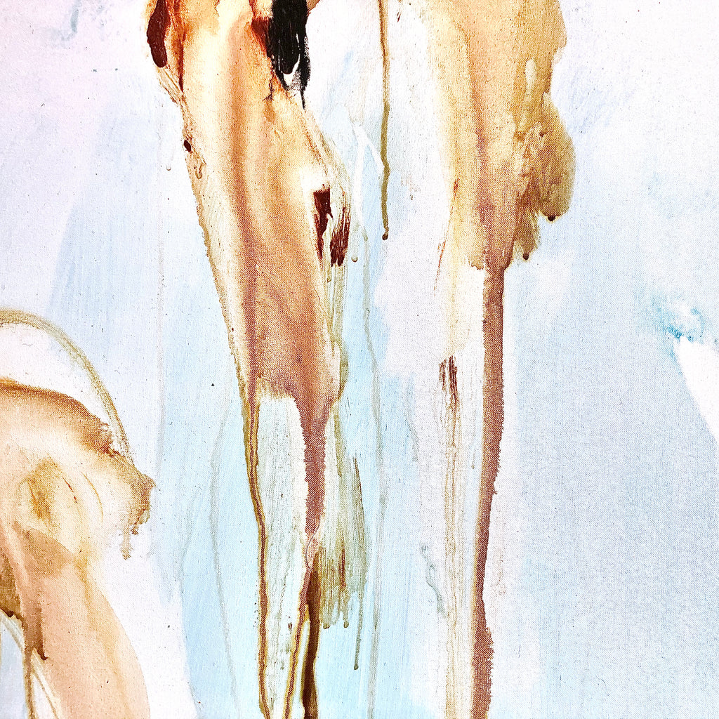 XL Painting of the Presence painting collection. A very soft palette of light blues and cool beiges creates a peaceful atmosphere. The shape in turquoise color evokes the model of the painting session...